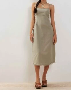 Una Distressed Hem Midi Slip Dress In Slate Green Linen