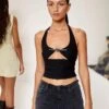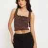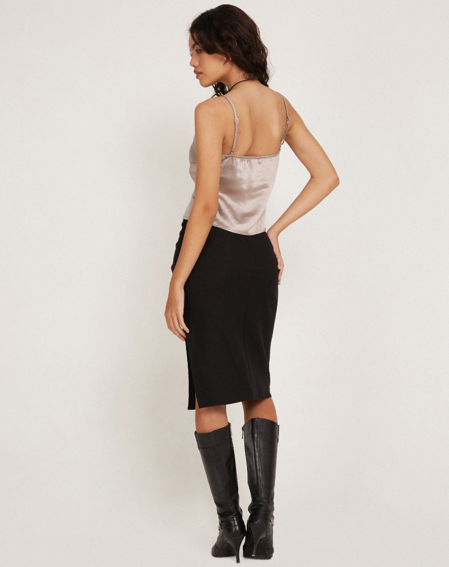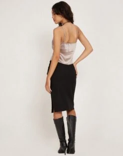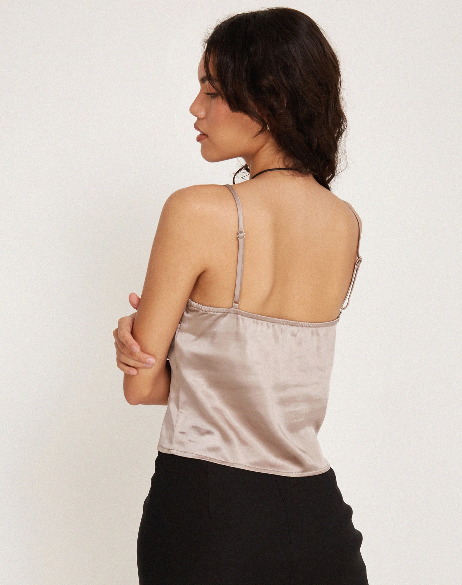 Turn heads in our Adalia top. In a champagne heavy satin fabric, it features a loose, cropped fit with cami straps and a V neckline. Detailed with a lace trim and tie straps centre front.