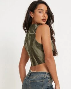 The basic you need. Our Ajak top features a crew neck and cropped fit with an all-over khaki print. Get the look and style with our Vinsa cargos.