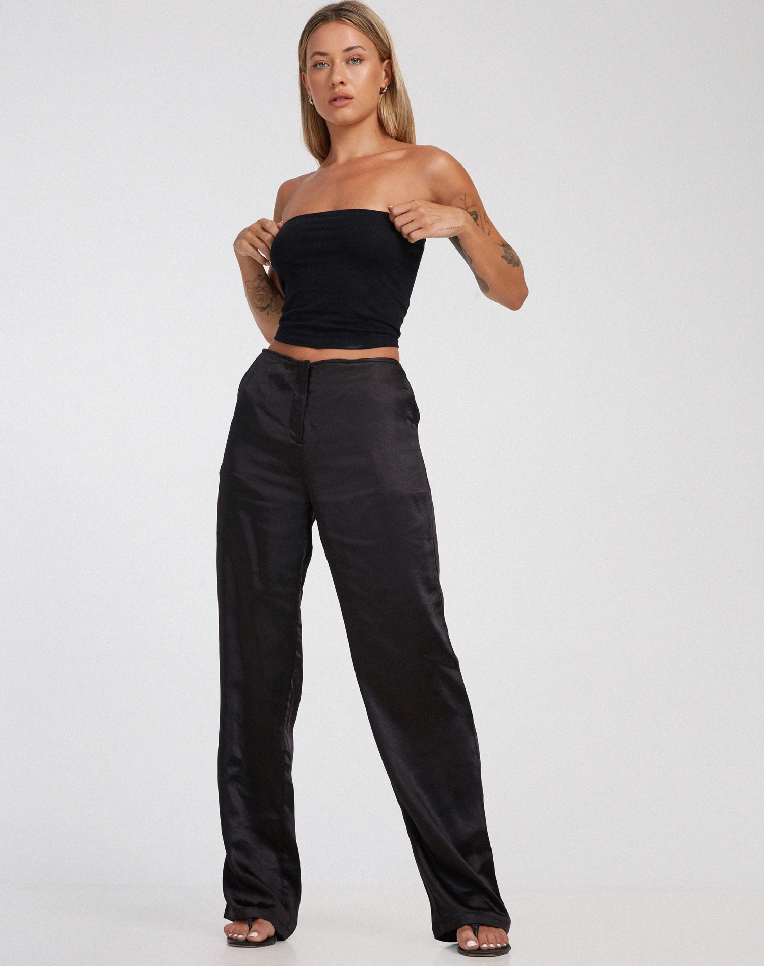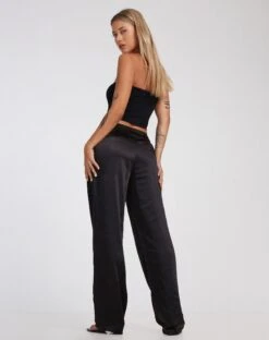 Low-rise straight leg trouser in a baggy fitting heavy satin fabric, with clean waistband. Features centre front zip fastening and welt pockets at the back. Style with the Shae bandeau to get the look.
