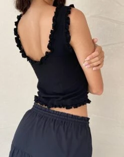 In a black woven fabric, the Alsa top features a vest design with a loose fit, thick straps, and a scoop neckline. Complete with ruffle edging for an extra touch of style. We love to wear with our Reef skirt.Â