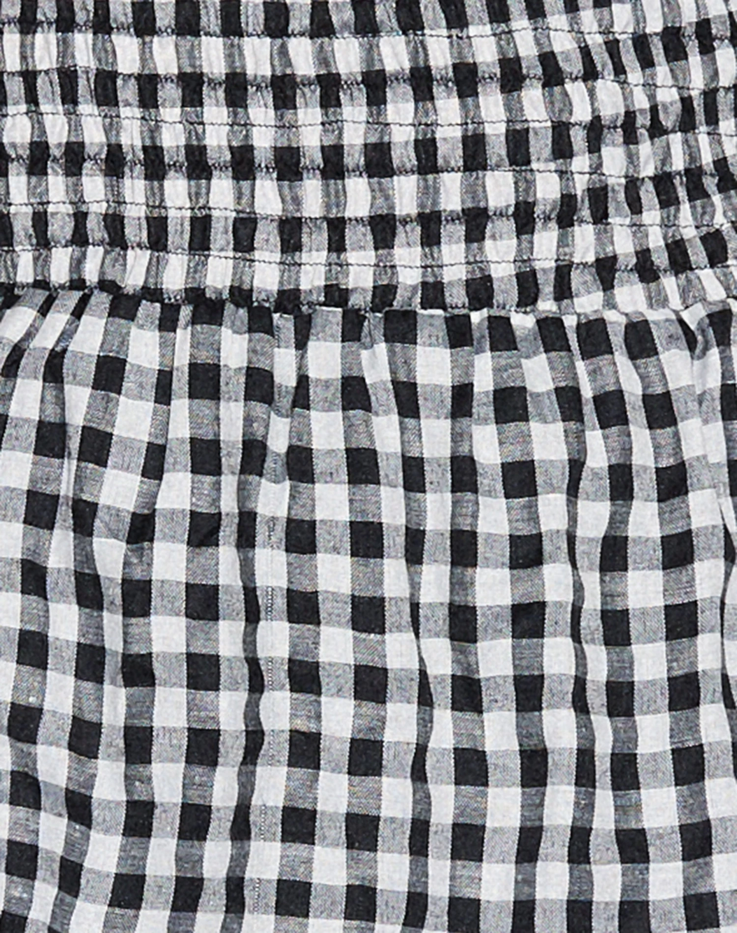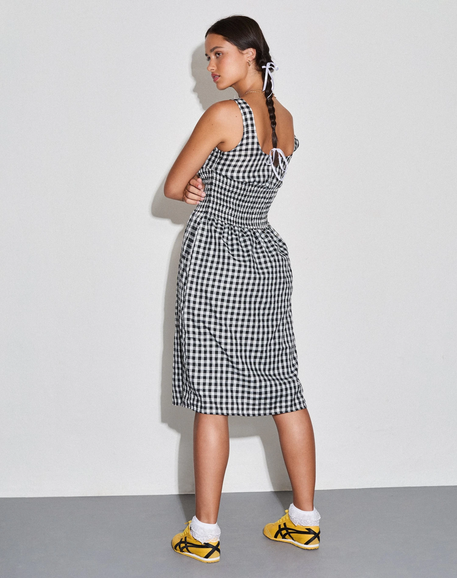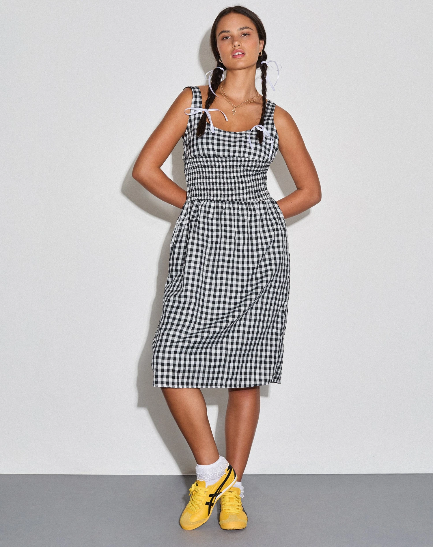 Our Ambrose Dress is the perfect ‘fit for spring. Featuring a knee length midi fit, a square neckline, shirring from the underbust and a full skirt. It comes in a black and white gingham print and features side pockets.