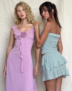 In a sheer powder blue fine knit, our Anis skirt features an elasticated waist band and mini length lettuce hem with ruffle and tentacle frill detailing. Match it up with our Ameera bandeau.