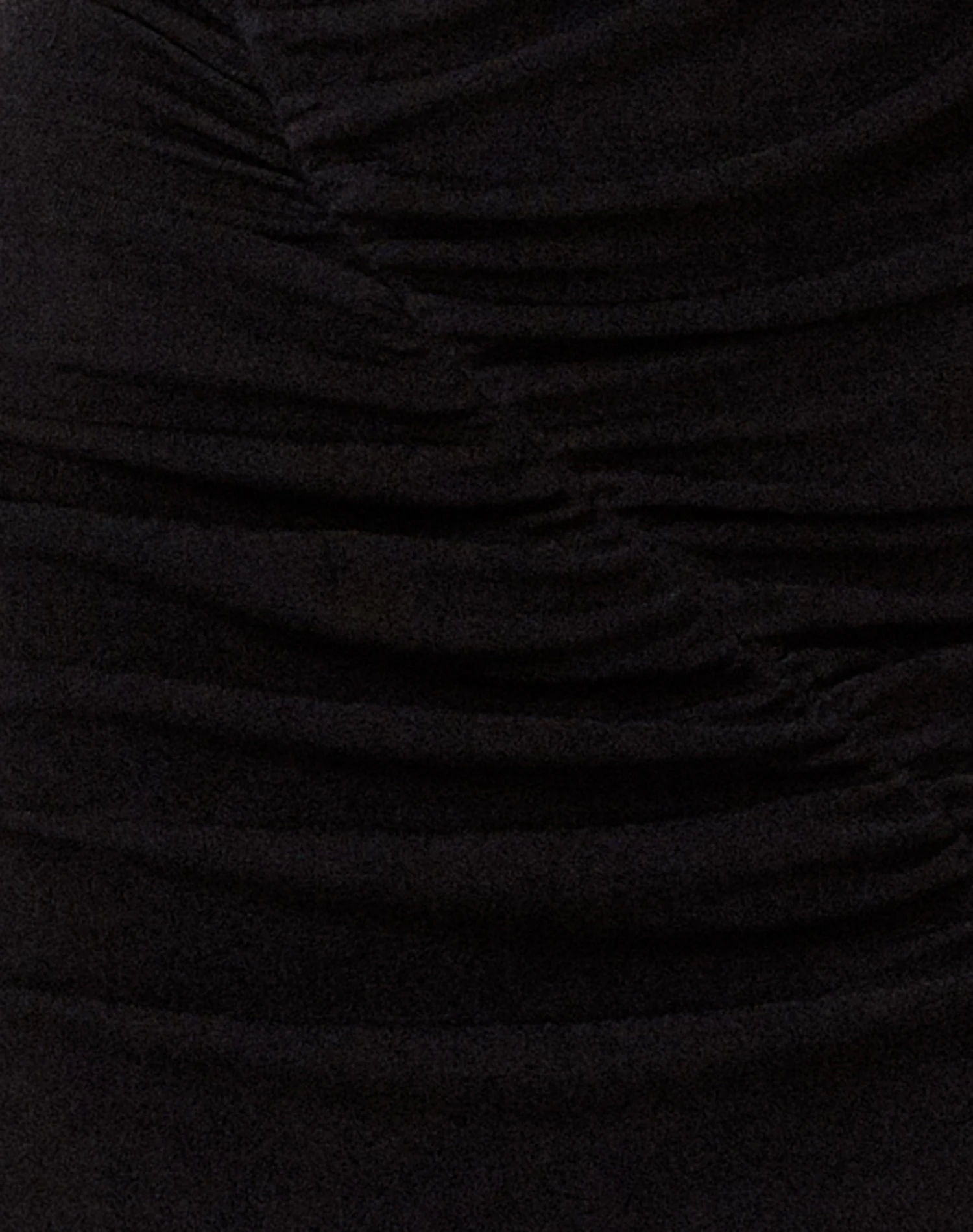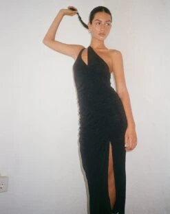The Arista dress is essential when it comes to weekend dressing. Featuring a midi fit with one shoulder design and side split in black.Â