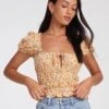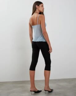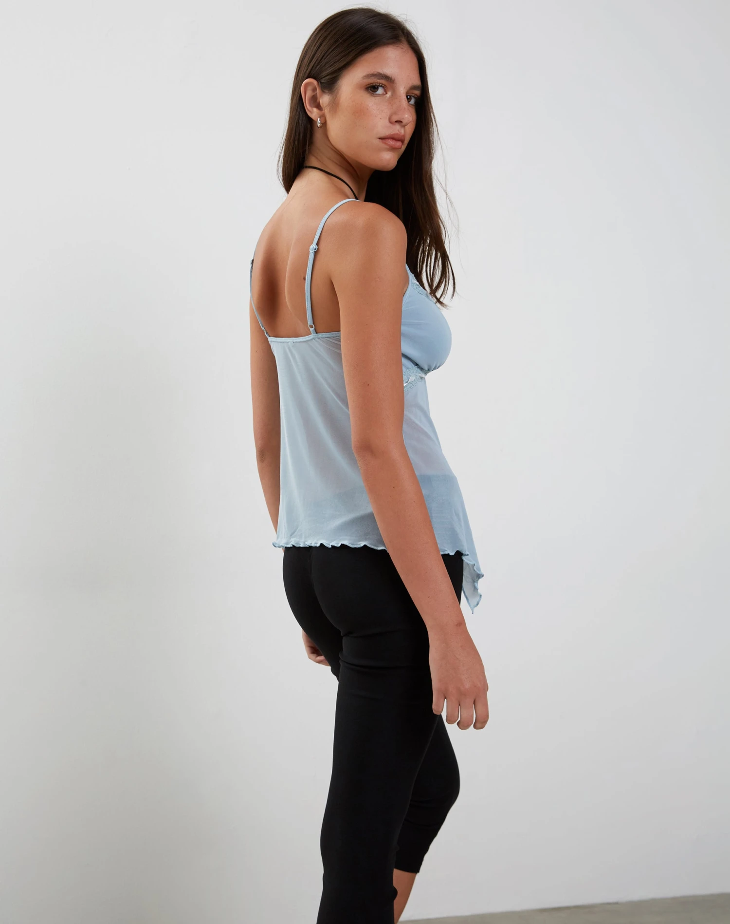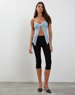 Our Arsyla butterfly top features thin straps with lace trim cup detailing, a delicate white ribbon bow applique at the centre front and split butterfly hem in a pale green floral print. We love to pair with our Shine capri pants.