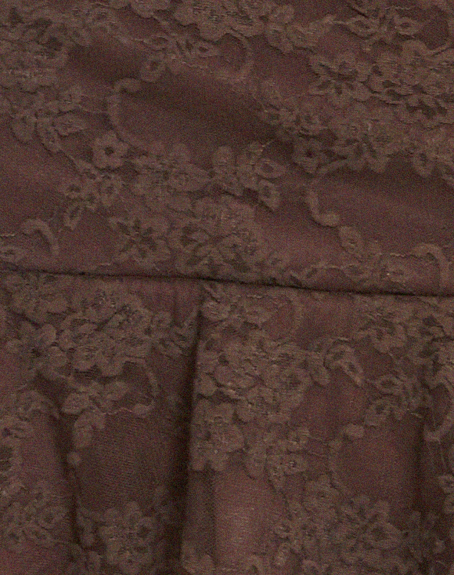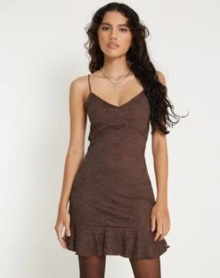 Chestnut brown mini dress with thin straps and a plunging low neckline featuring a brown lace overlay and lace detailing to hem.