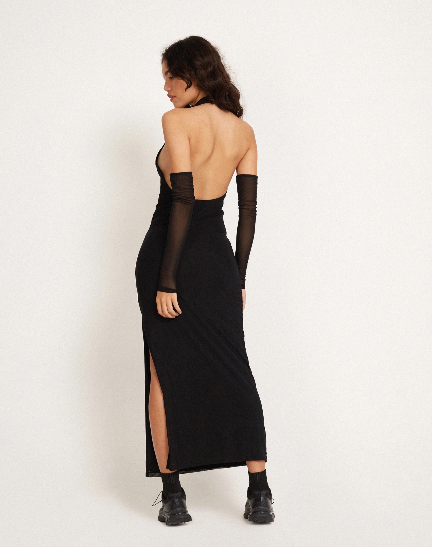 Halterneck maxi dress in black, featuring a deep v neckline, bodycon fit and detachable sleeves with mesh overlay.