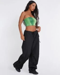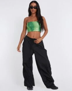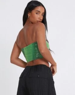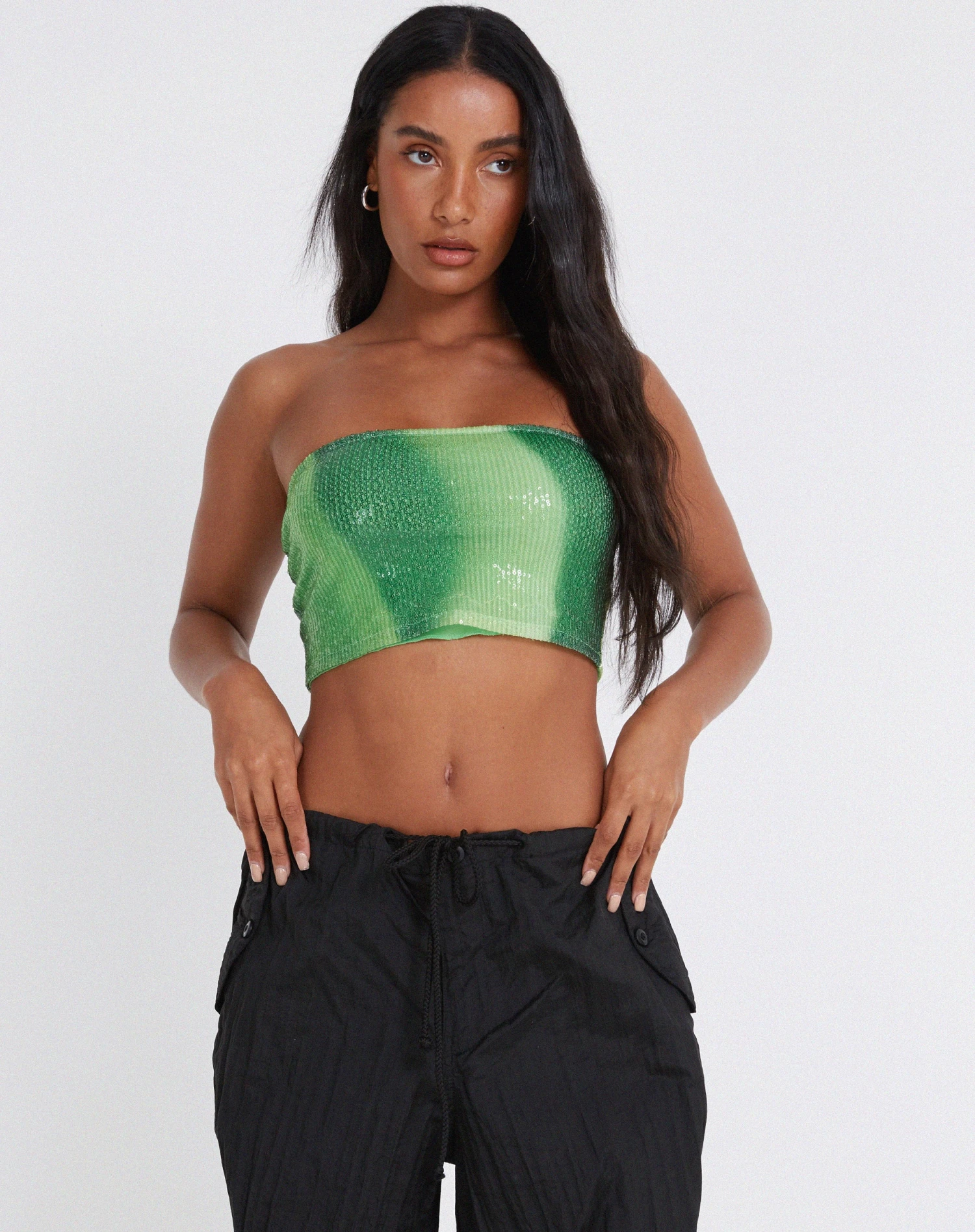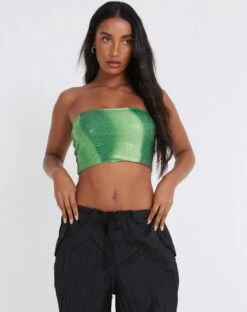 Add a touch of sparkle to your look with the Bandira top. Featuring a cropped fit with bandeau design in a solarized green sequin finish. Finish the look with our iconic chute trousers in black.