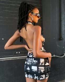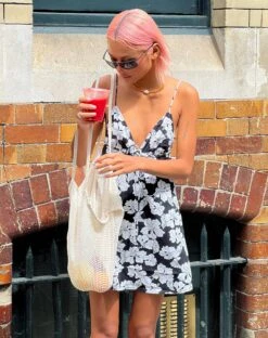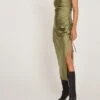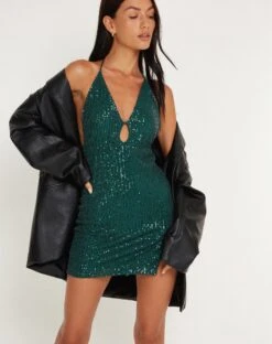 The Bernoki Mini Dress is a Motel favourite. Featuring a deep plunge V neckline with a keyhole detail, a halter tie and a single leg split, in a fully lined drape sequin green fabric.