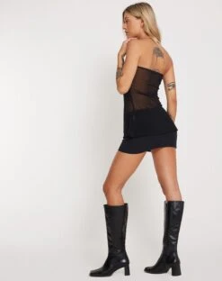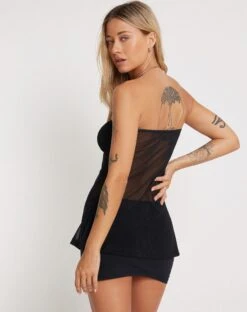 Bandeau top with sleeveless design in black knit with mesh lining. Featuring a front split hem down the centre. Style with our Lidya Mini Skirt to ad an edge to your night out ‘fit.Â