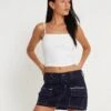 Our Braya skirt in dark indigo features a wrap detail in a cute mini length. We like to style with our Hedva top.