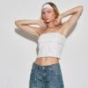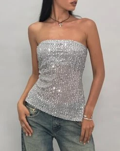 Get the look with our Brilia Top. Featuring a bandeau neckline and a side split in a sequin silver. We love to style with our Roomy jean.