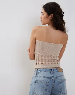 In a neutral knit fabric, the Camille top features a bodycon fit with a sleeveless, bandeau design and laddered detailing to the midriff. We love to wear with our Roomy jean.