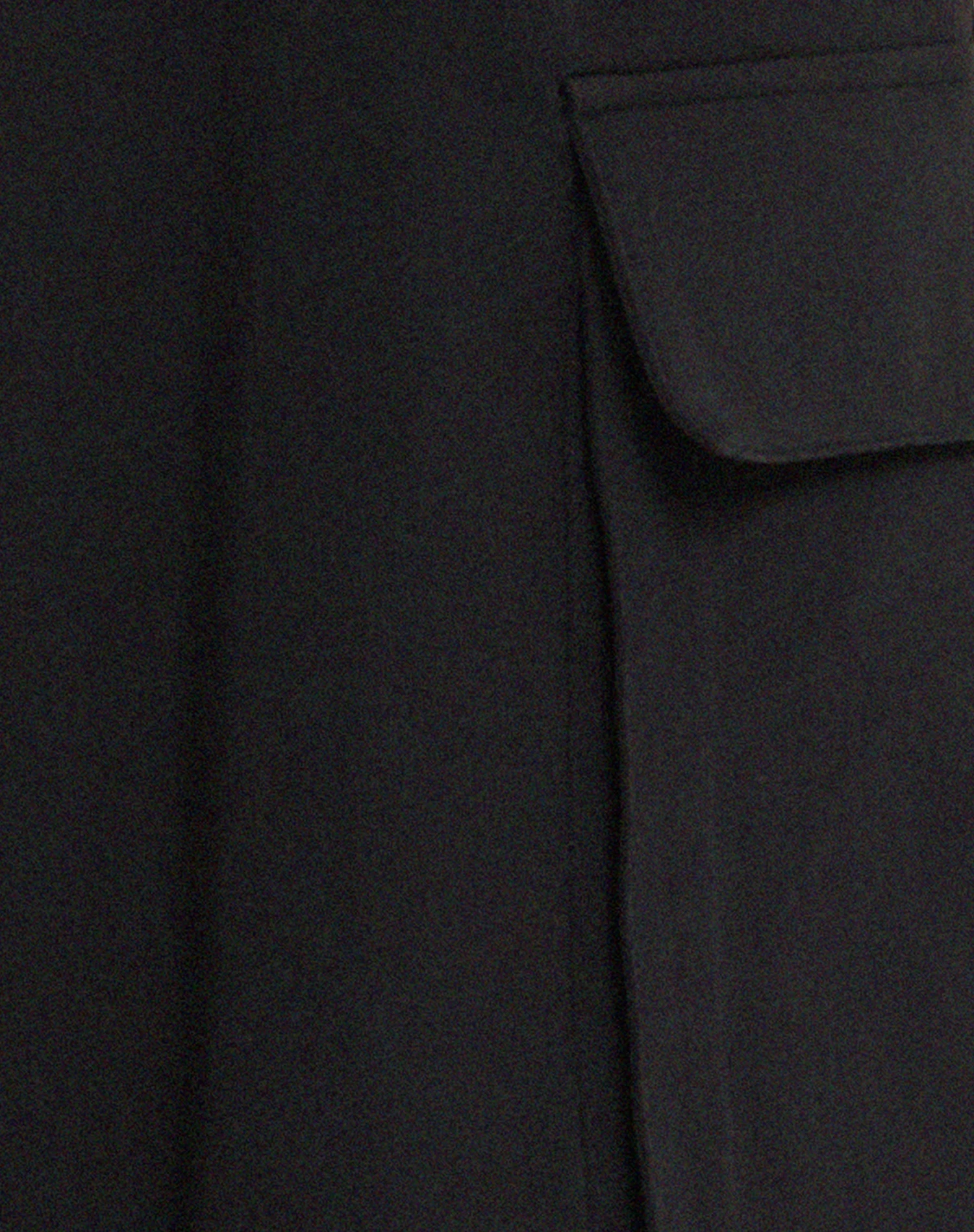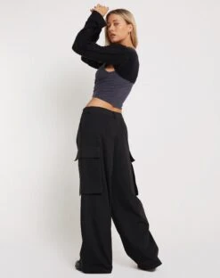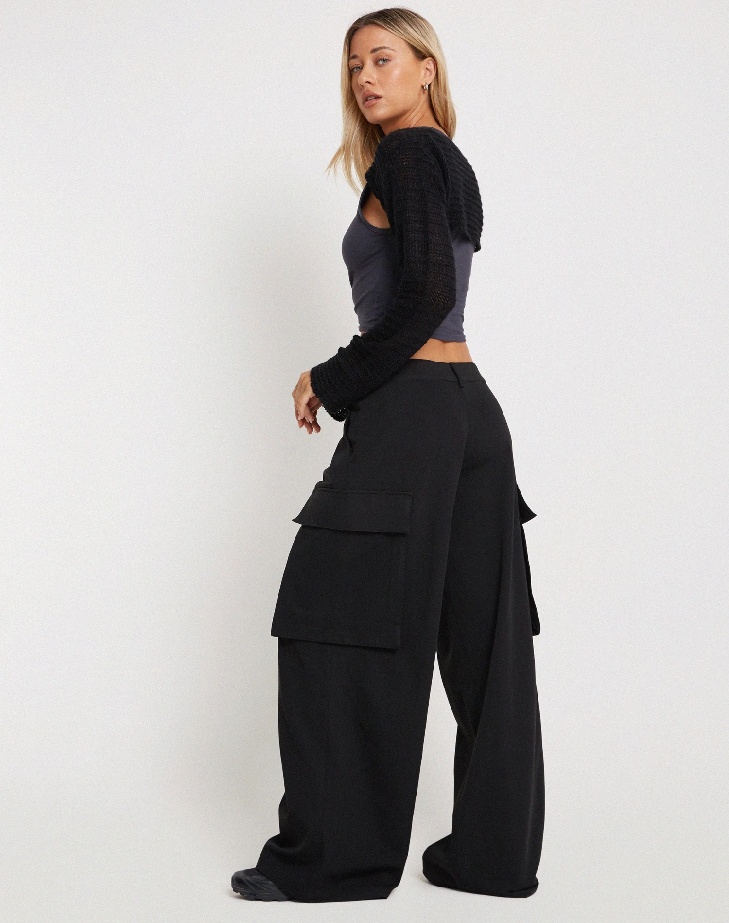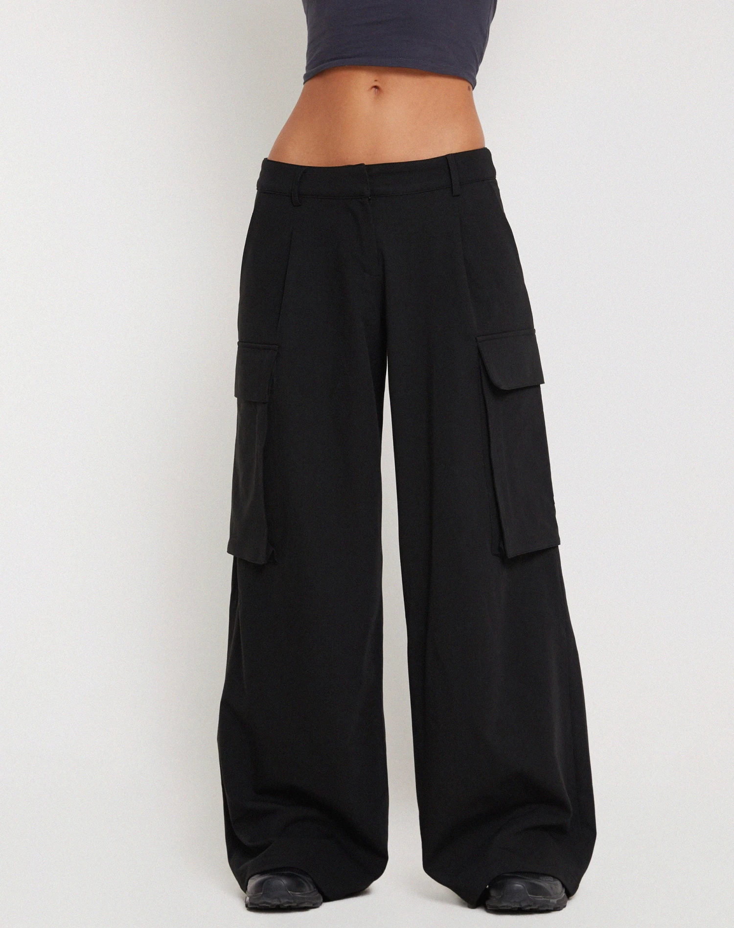 Low rise wide leg cargo trouser in woven tailoring black. Featuring large front pockets, belt loops and a zip fastening. Complete the ‘fit with our Monlo vest top and Nobila shrug.Â