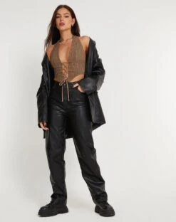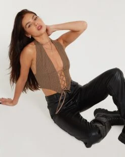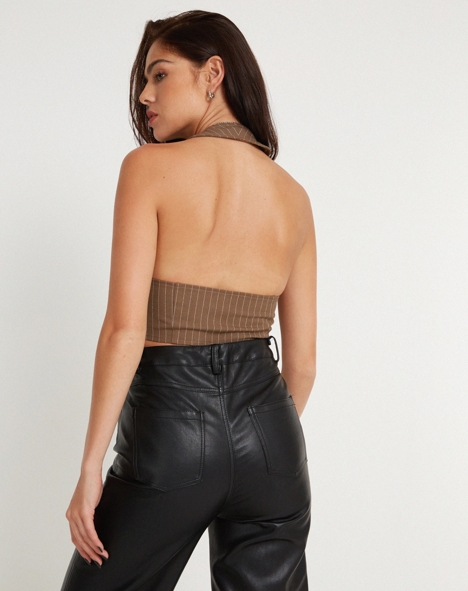 The Canisba top is here for a chic look. Featuring a cropped fit with halter neckline and tie up detailing in a pinstripe brown. Pair with our Zova trousers for a chic fit’. Â