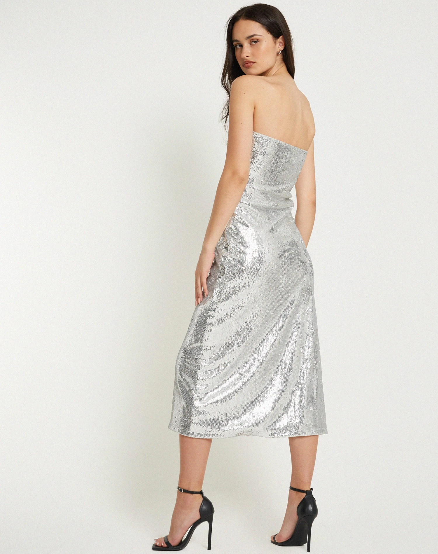 It’s officially sparkle season – Our Cleosa bandeau dress features a maxi hem and a drape sequin design in silver chrome.