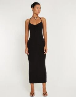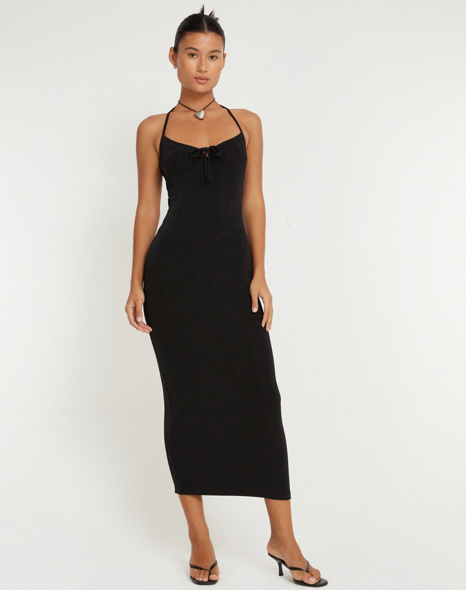 The Clovia, a dress for any occasion. Featuring a maxi fit with thin halter neck straps and tie up detailing in black.