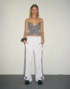 Level up your everyday ‘fit with our Coze jogger. Featuring a loose fit with wide legs and an elasticated waistband in white with navy double sports stripe. We love to style with our Dilara top.Â