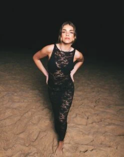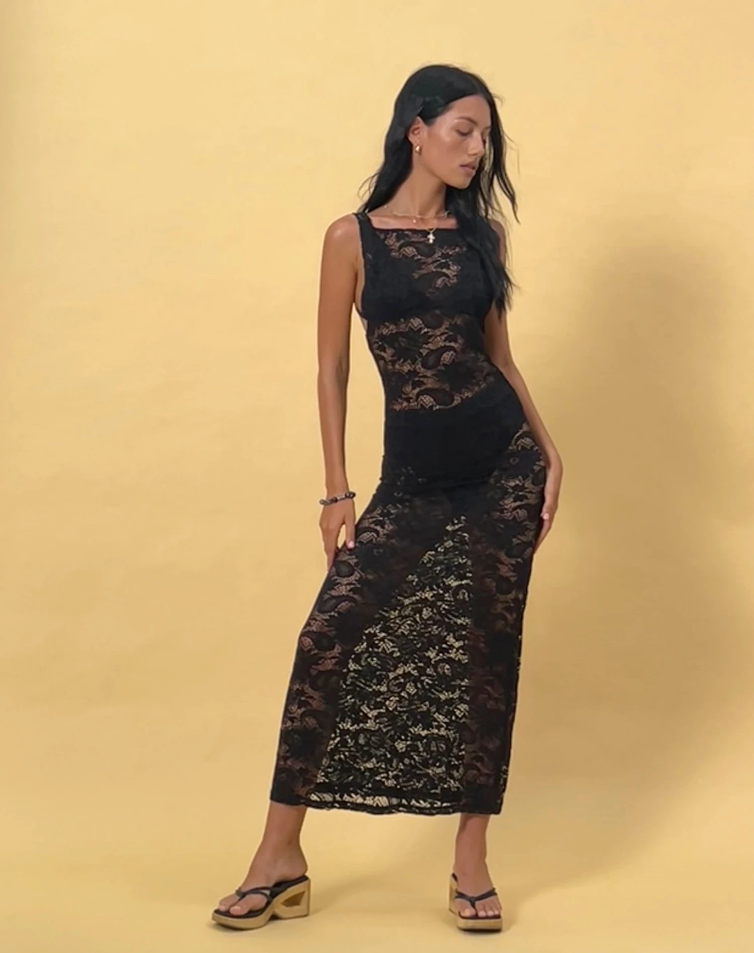 In black, this Daudy dress features maxi fit in an unlined lace with square neckline and self tie at the open back.
