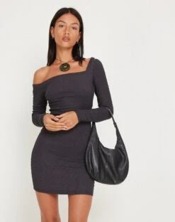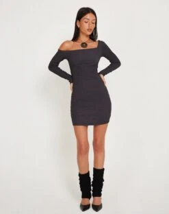 Stay simple yet stylish in our Dean dress. In a crinkle charcoal fabric, it features a mini, bodycon fit with long sleeves, a square neckline and one-shoulder design.