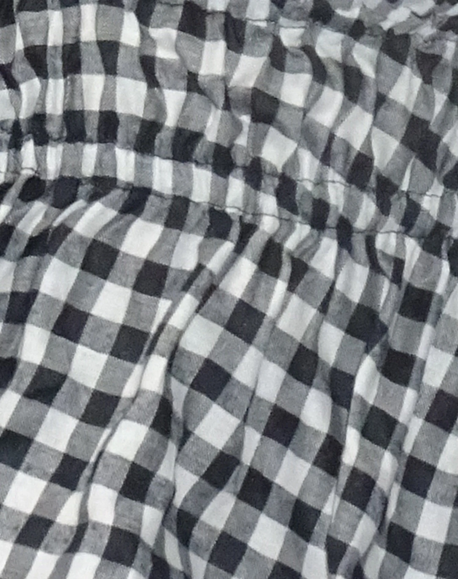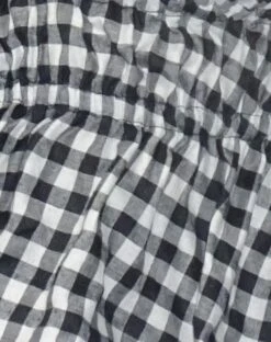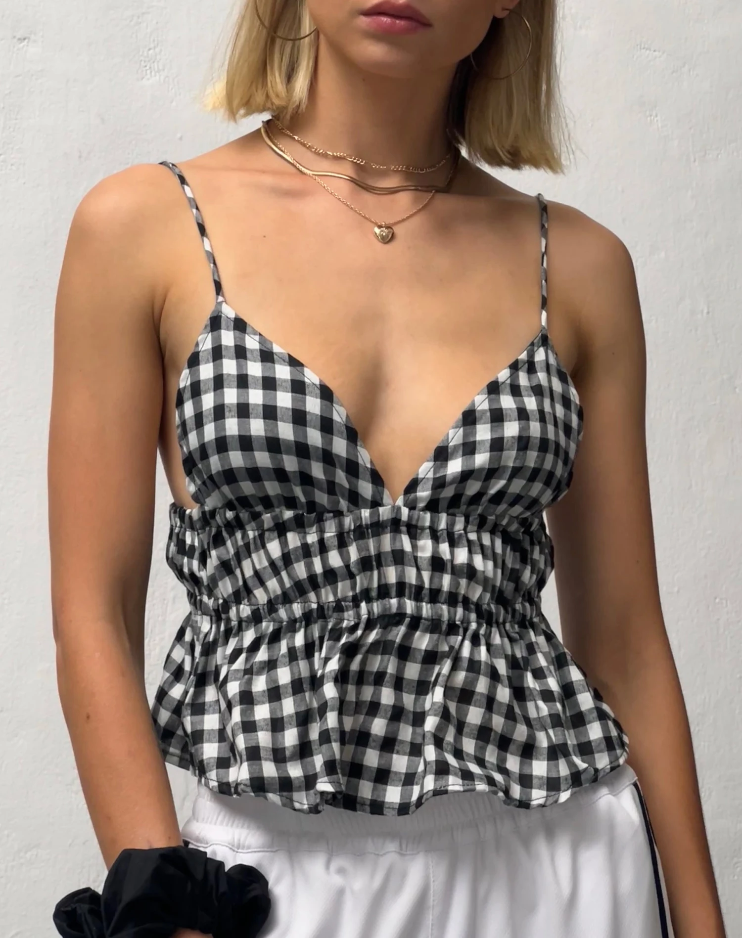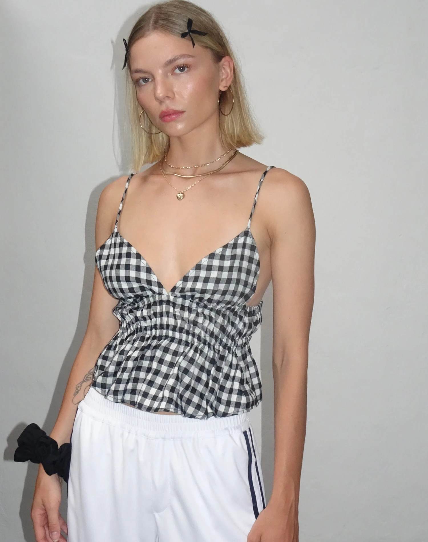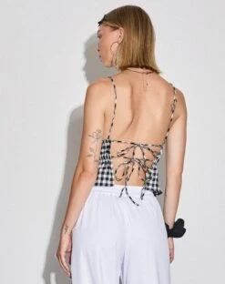 The Dilara Cami Top features a plunge neckline and a tie at the back, in a black and white gingham print. We love to style with our Coze  wide leg jogger.Â