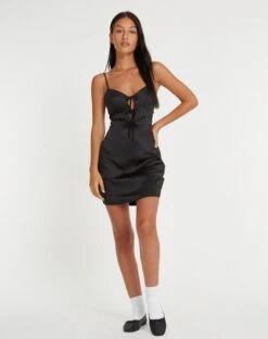 Get occasion ready with the Dirta dress. Featuring a mini fit with thin straps and tie up detailing in a satin black.