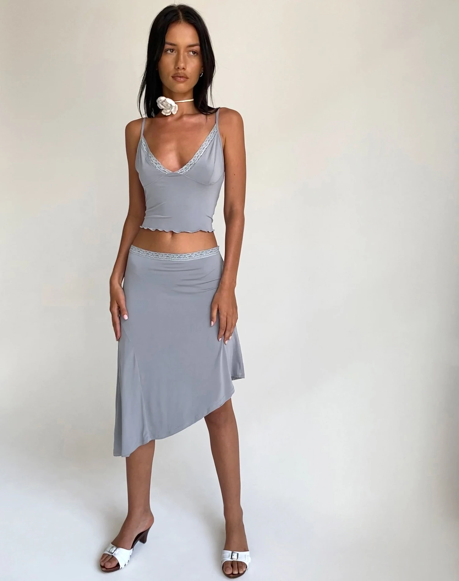 The Drew Skirt features a midi fit, an asymmetric hemline and comes in a slinky grey material. Complete the co-ord with our Yenika top.Â
