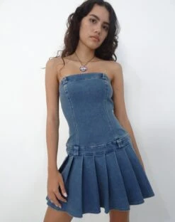 Denim midi skirt in indigo blue, features a low rise with fit and flare design. The skirt for every occasion. For the perfect fit pair with our Koriya topÂ