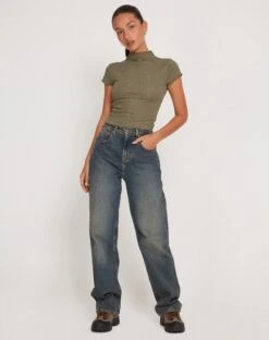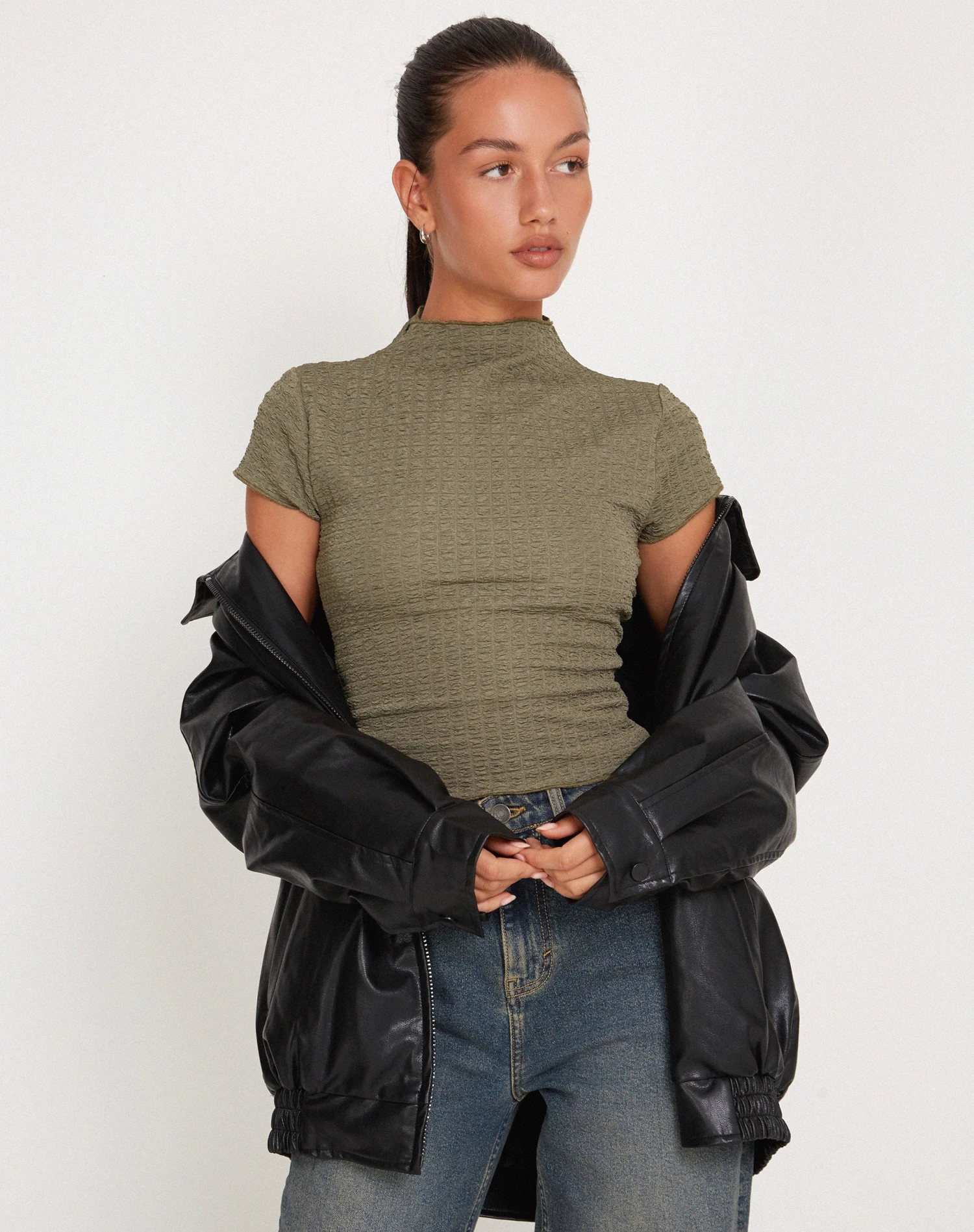 The Elton Top features a high neckline, short sleeves and open back design in a khaki green. We like to style with our Parallel jeans.