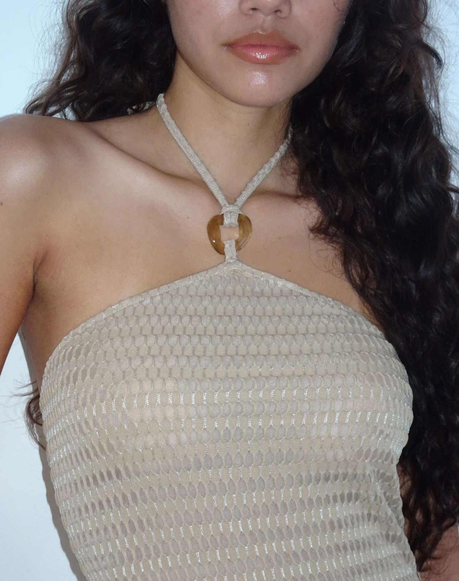 Coastal evenings pending in our Emersyn waffle knit bodycon dress. Featuring a resin O Ring detail halterneck in a semi sheer oat waffle knit with midi length hem, Emersyn is the perfect holiday dress.