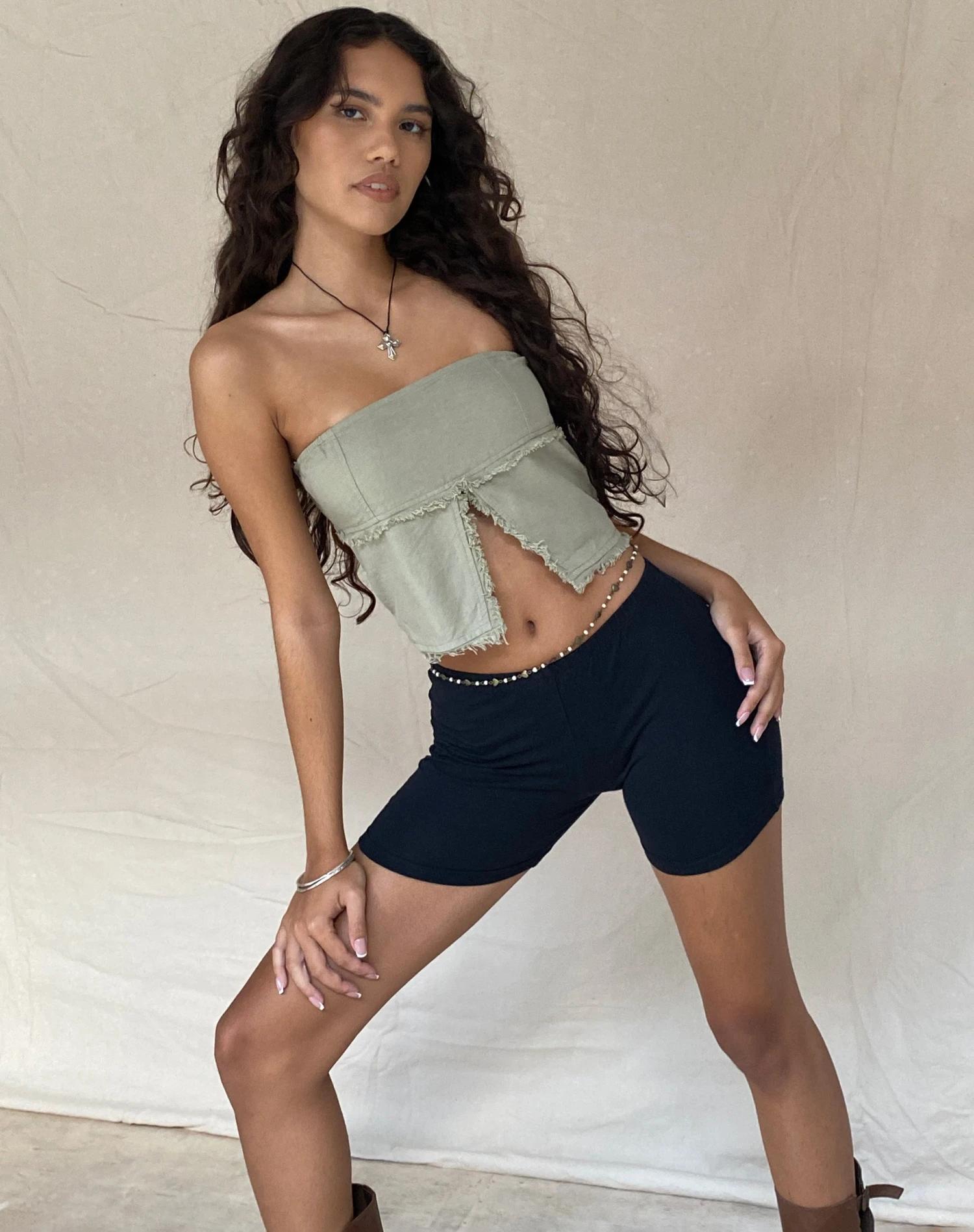 Enzie features a bandeau neckline with darted bust panel and a split butterfly hem with raw distressed edges in a slate green linen. Pair with our matching Ralina skirt.