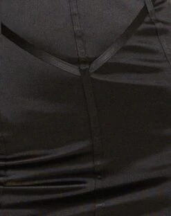 Satin mini dress in black, with a deep V neckline. Featuring bowing corset detailing, sleeveless thick straps and low back detail. This bodycon dress is a classic little black dress for every occasion.