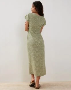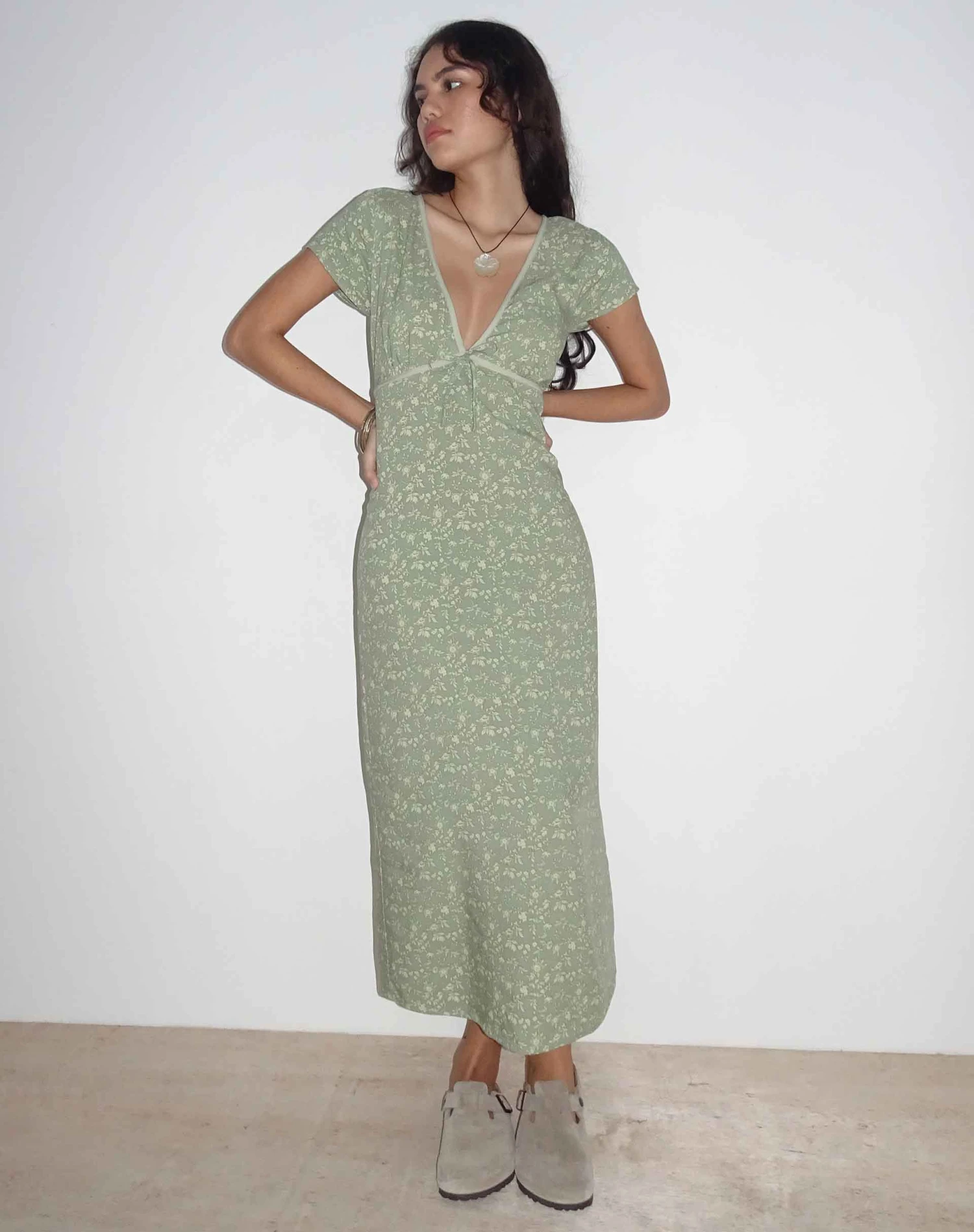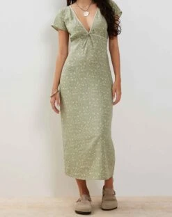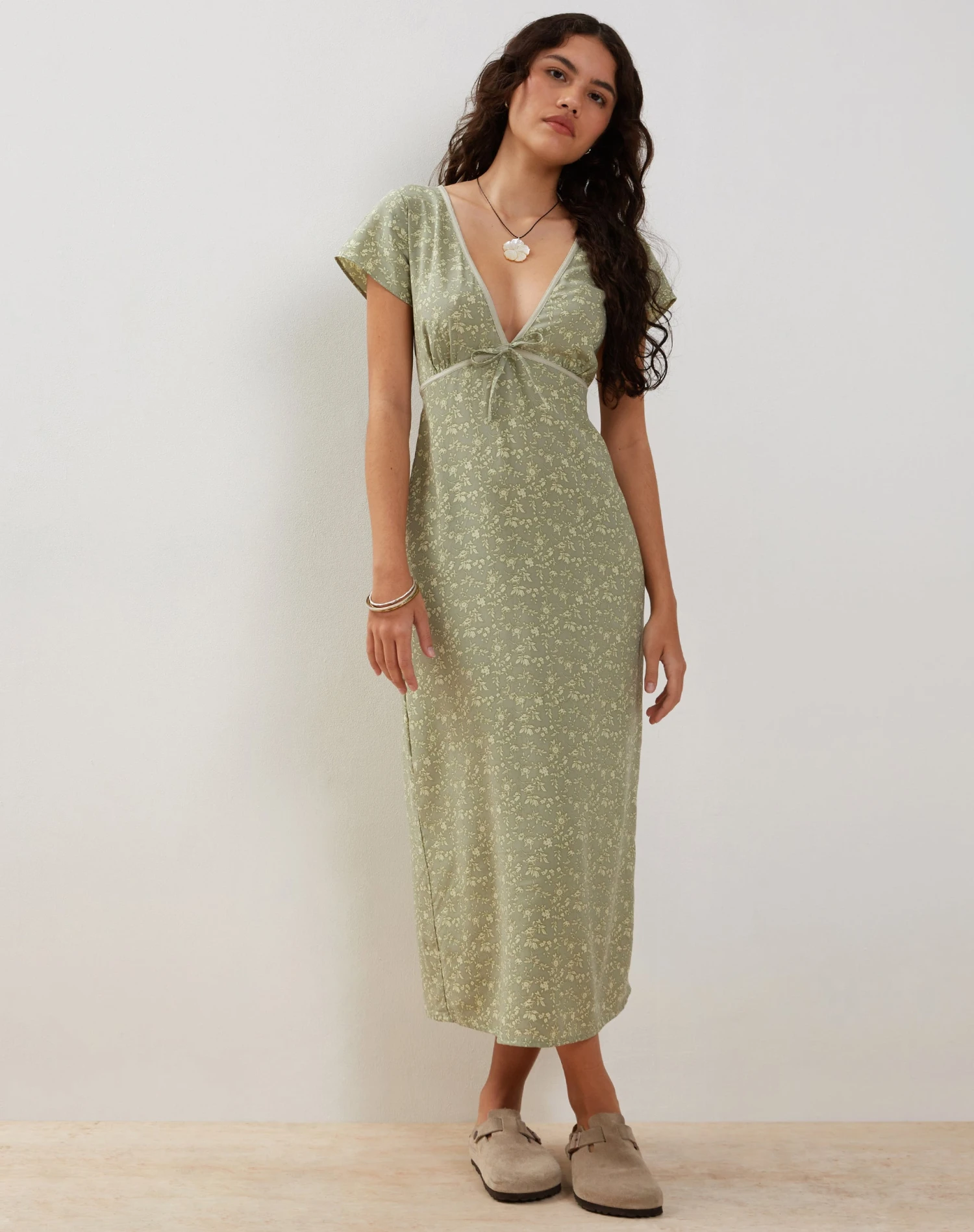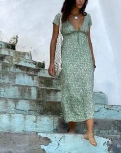 Add some print to your wardrobe with the Eviaso dress. In green with a ditsy floral print, it features a slim, midi fit with short sleeves and a plunge V neckline with tie straps for bow detailing.Â