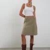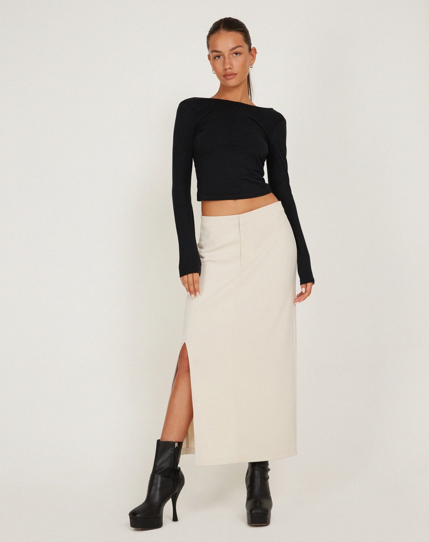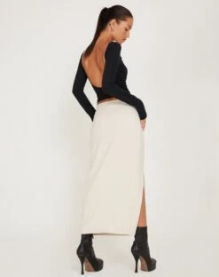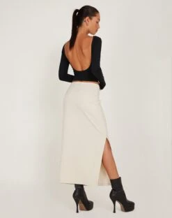Light cream maxi skirt in a heavy tailored fabric featuring a concealed zipper and fly, belt loops, split on right hand side as worn and pockets on the front. The perfect maxi skirt for that everyday fit.