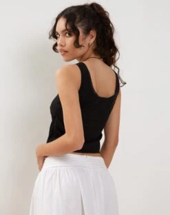 In a black poplin fabric, our Fawn top features a regular fit with thick straps, a square neckline and button clasp fastenings down the front. We love to style with our India midi.