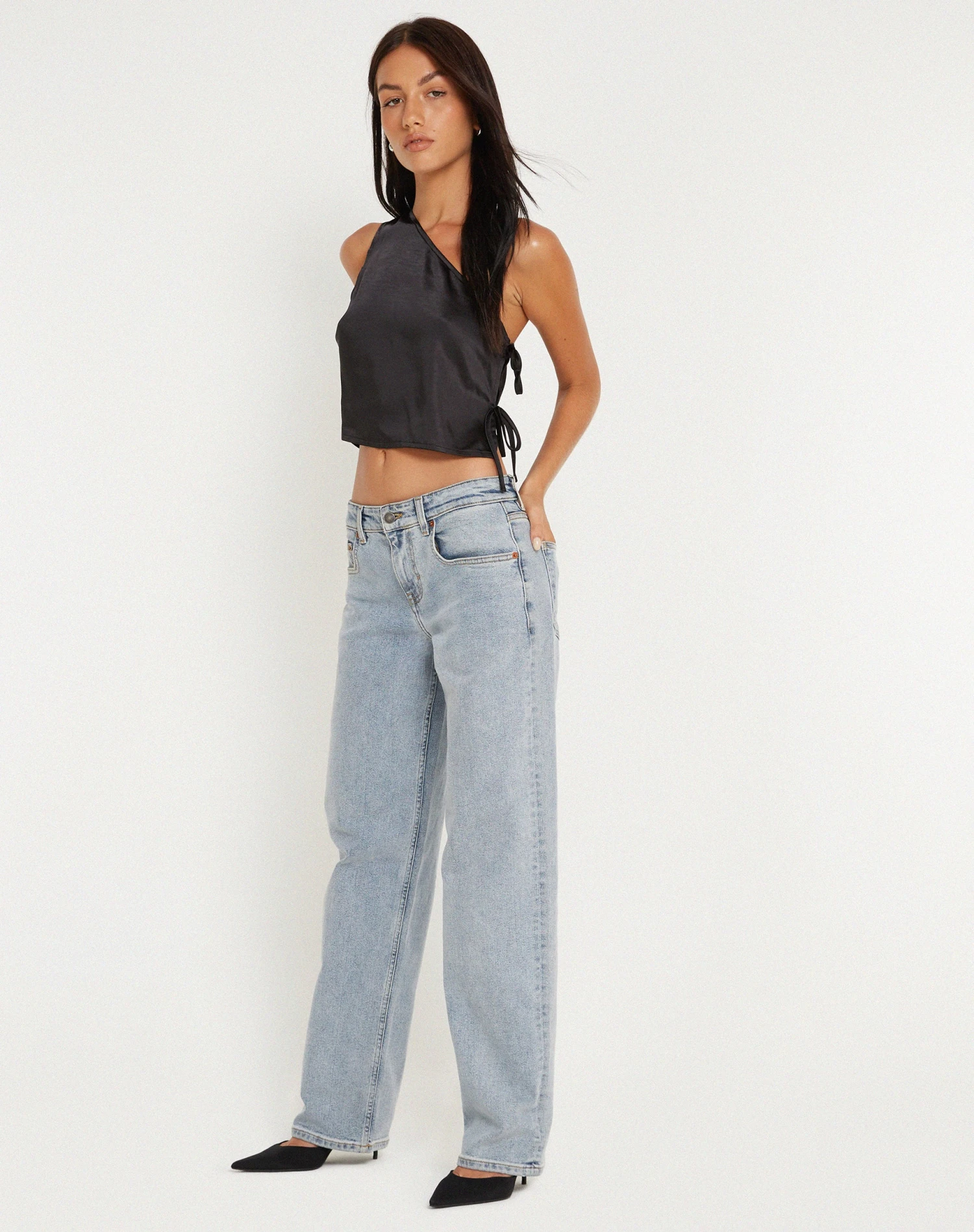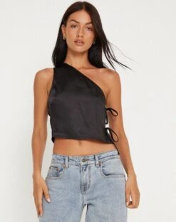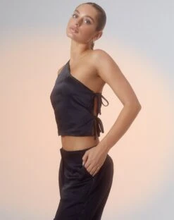 Dress to impress with our Floella top. In black, it features an asymmetrical design with tie up detailing to the side. Complete the look with the Akuna satin trousers.