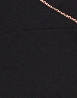 Jersey mini dress in black featuring a wrap design with cream binding on the deep V neckline with cap sleeves. The little black dress for any occasion.