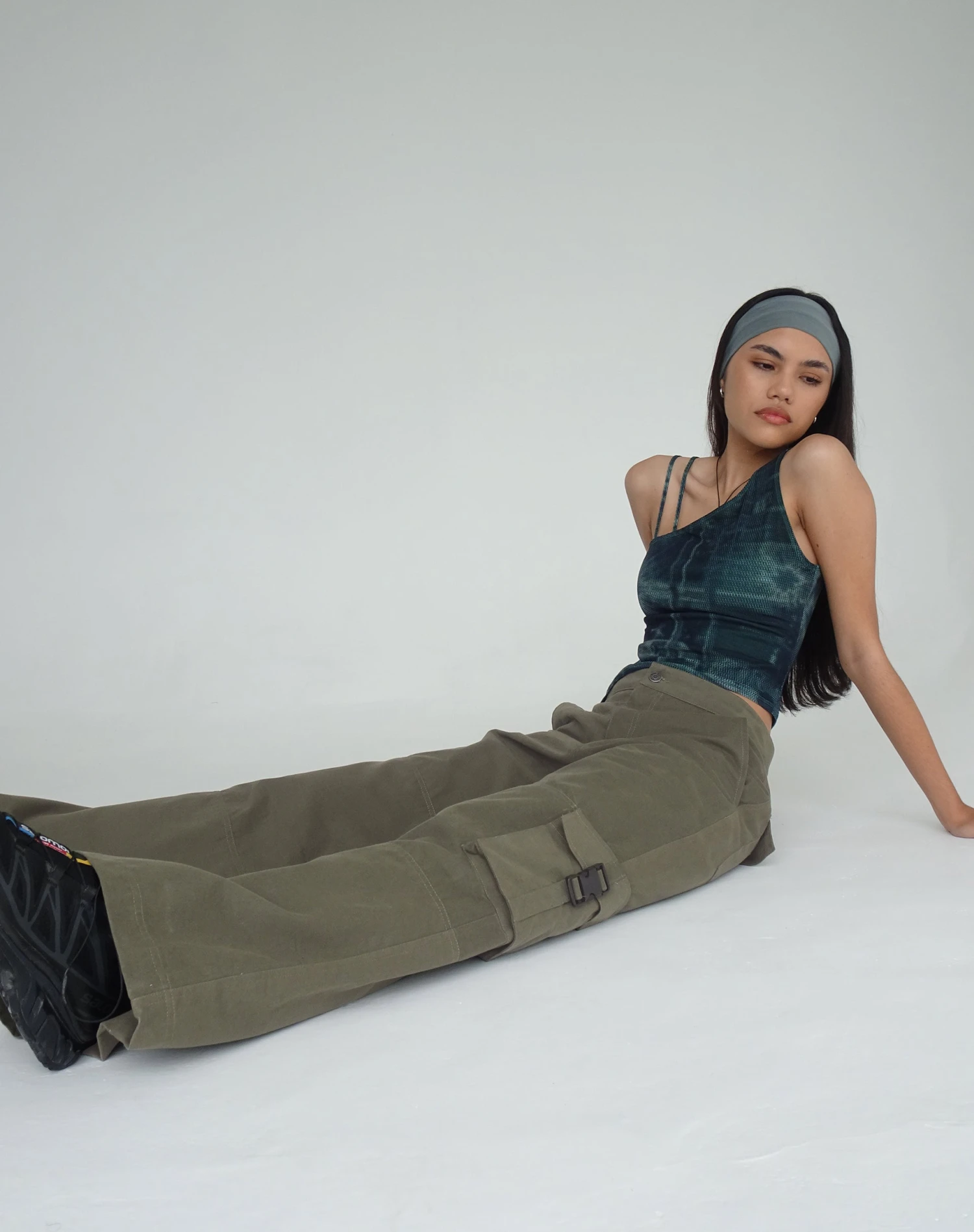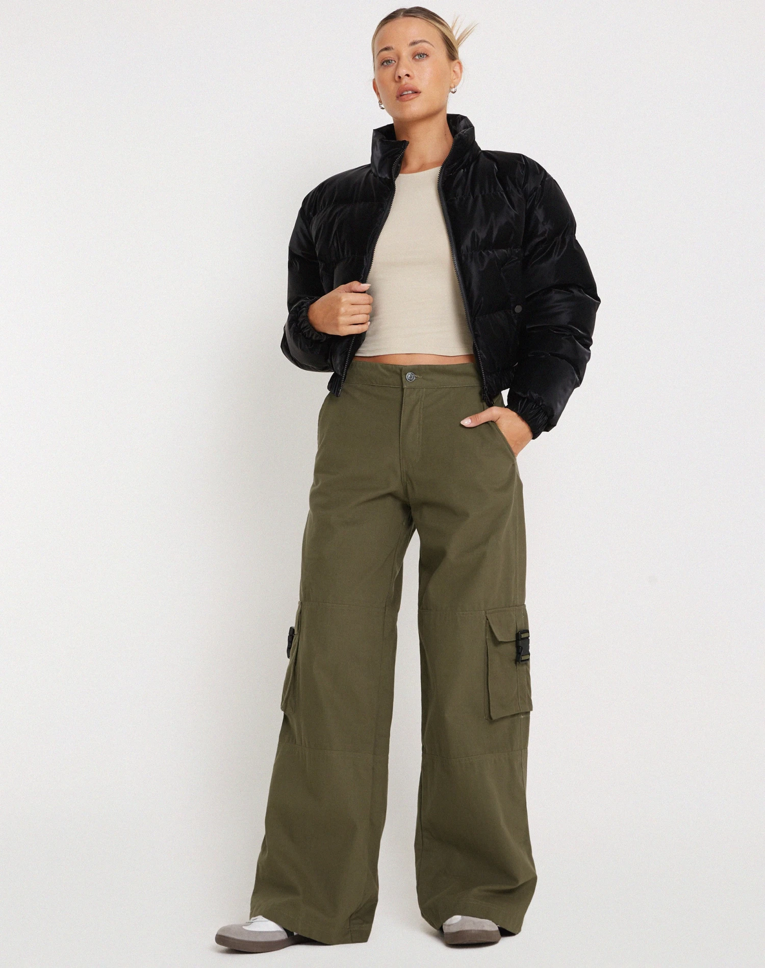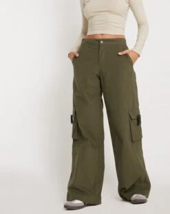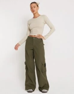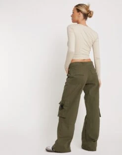 Cargo trouser in military khaki, featuring a low rise waist and side pockets. We like to pair with our Lanica Top.