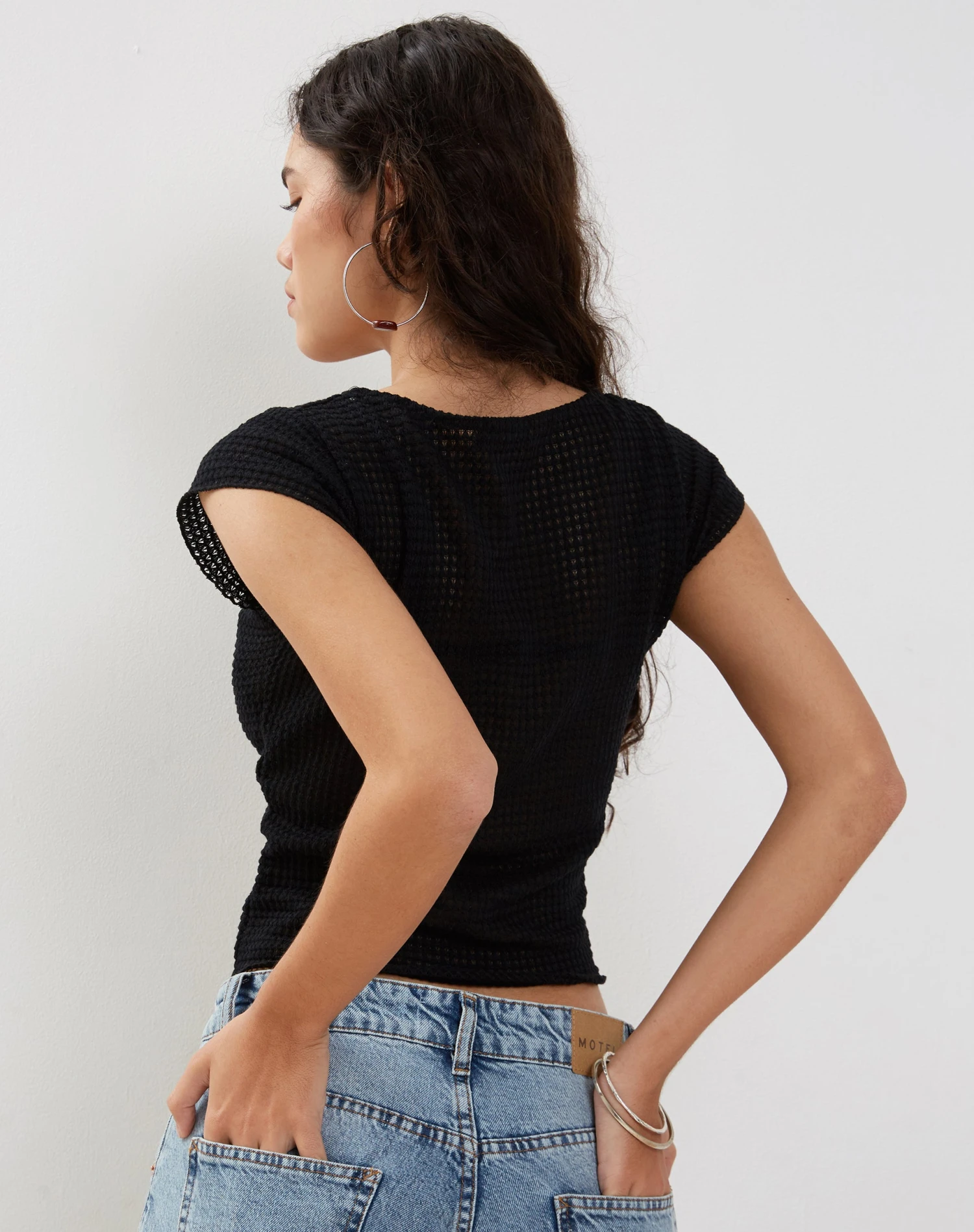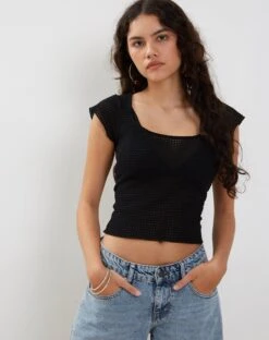 The Giannia top features a cropped fit with short, flared sleeves and a scoop neckline in a black textured crochet fabric. We love to pair with our Roomy jean.
