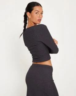 Spice up your basics with Ginny. In a charcoal crinkle knit fabric, it features a shrug overlay with long sleeves and a crew neckline. Complete the ‘fit with our Hadley skirt.