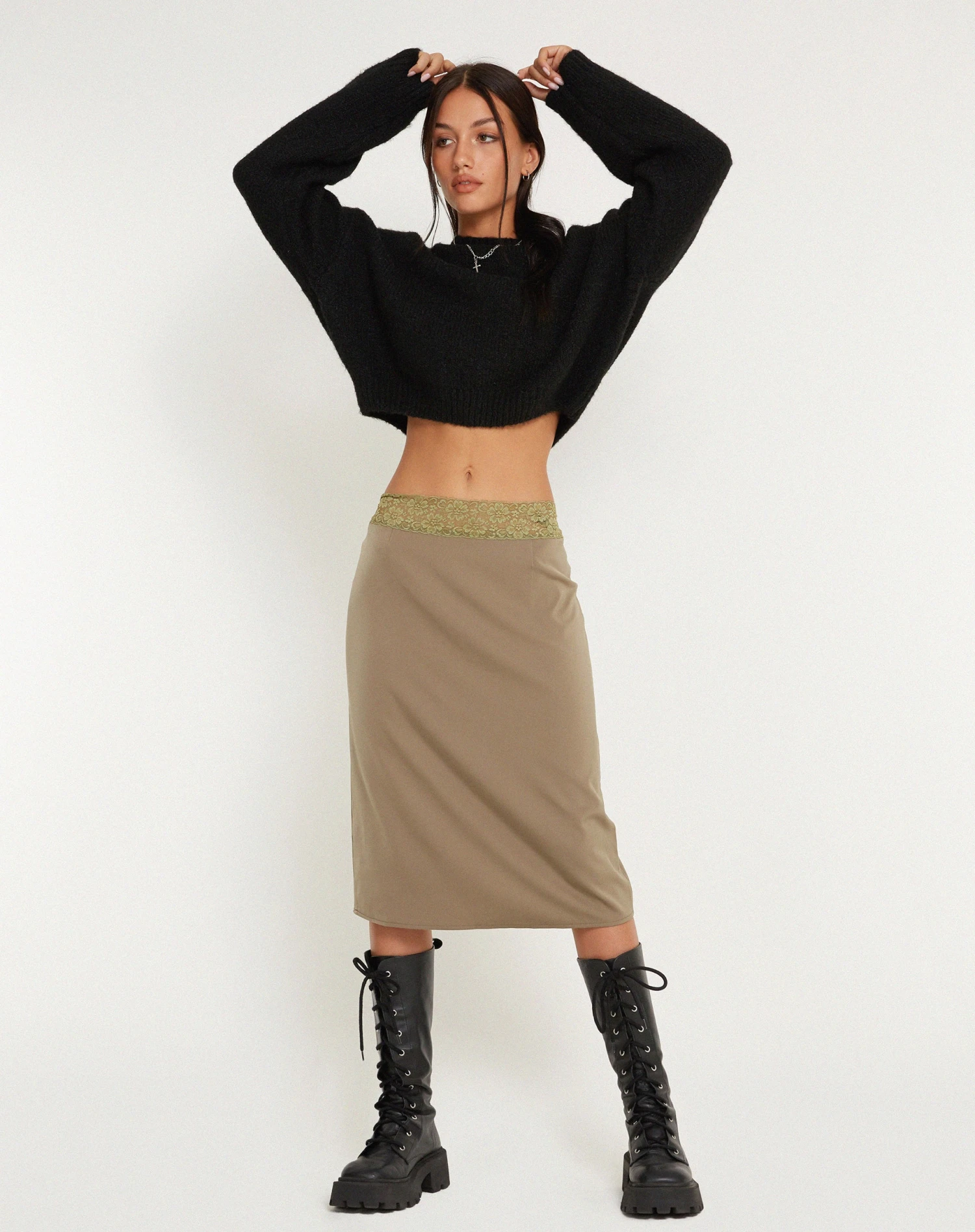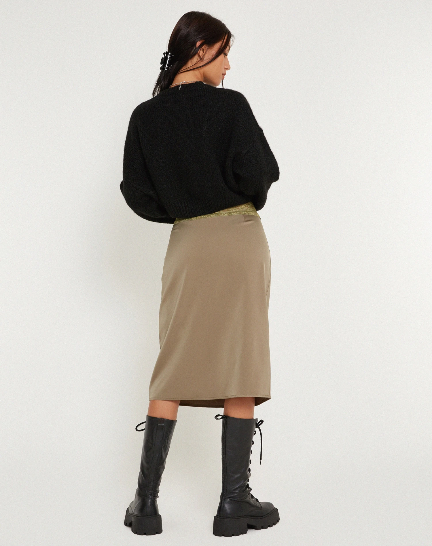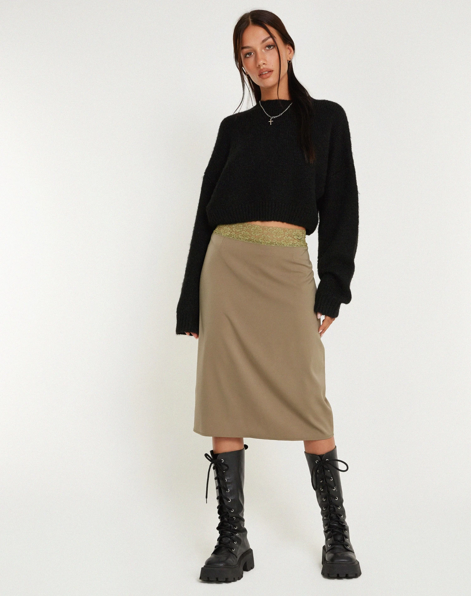 Midi length skirt in a dull satin avocado with contrasting lace detail waistband. Complete the co-ord with our Sahira top.Â