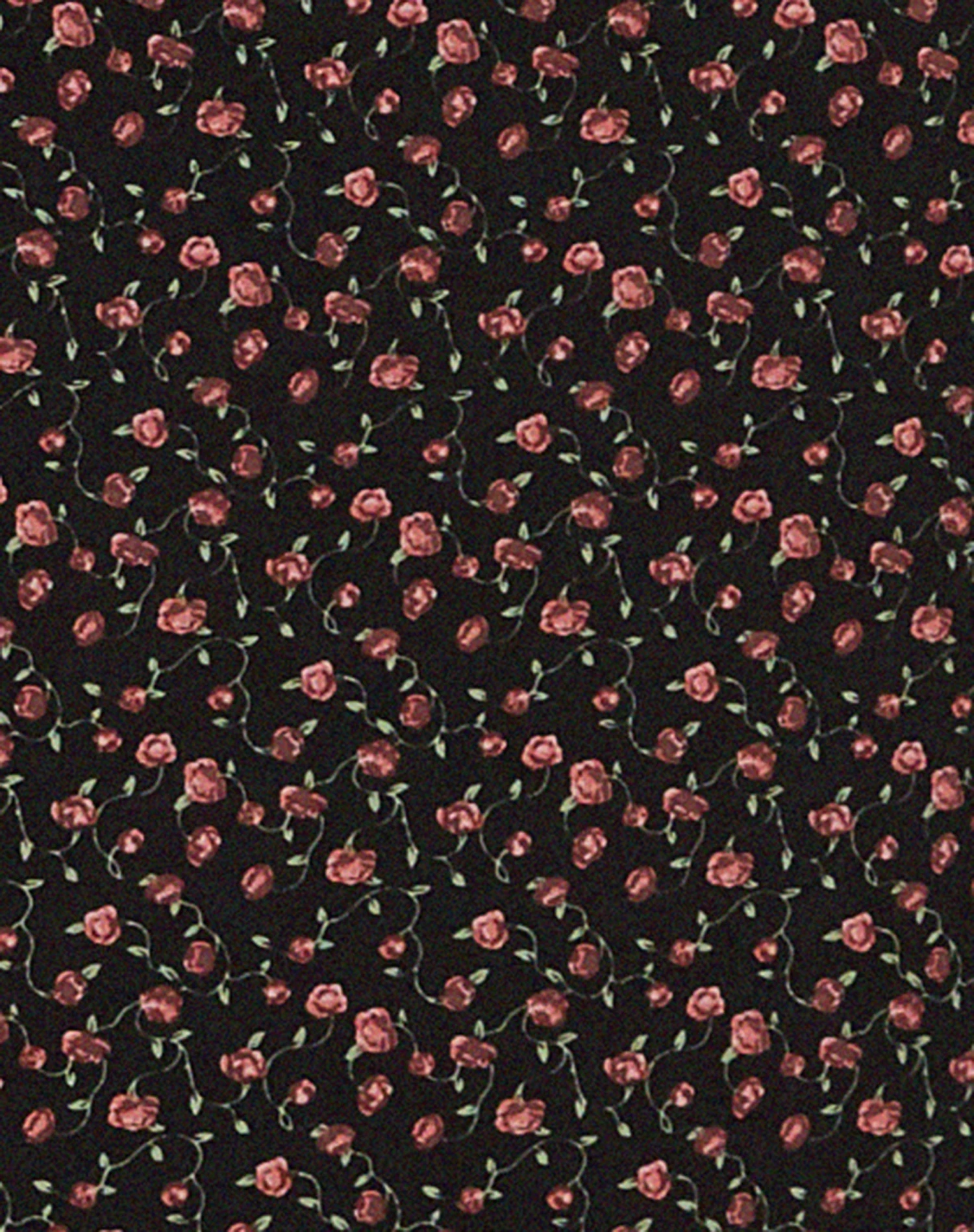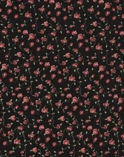 Corset detail maxi dress featuring elasticated cap sleeves, seaming under bust, lace up waist detail with eyelets and self ties in a ditsy pink rose print with a black ground on a woven fabric.