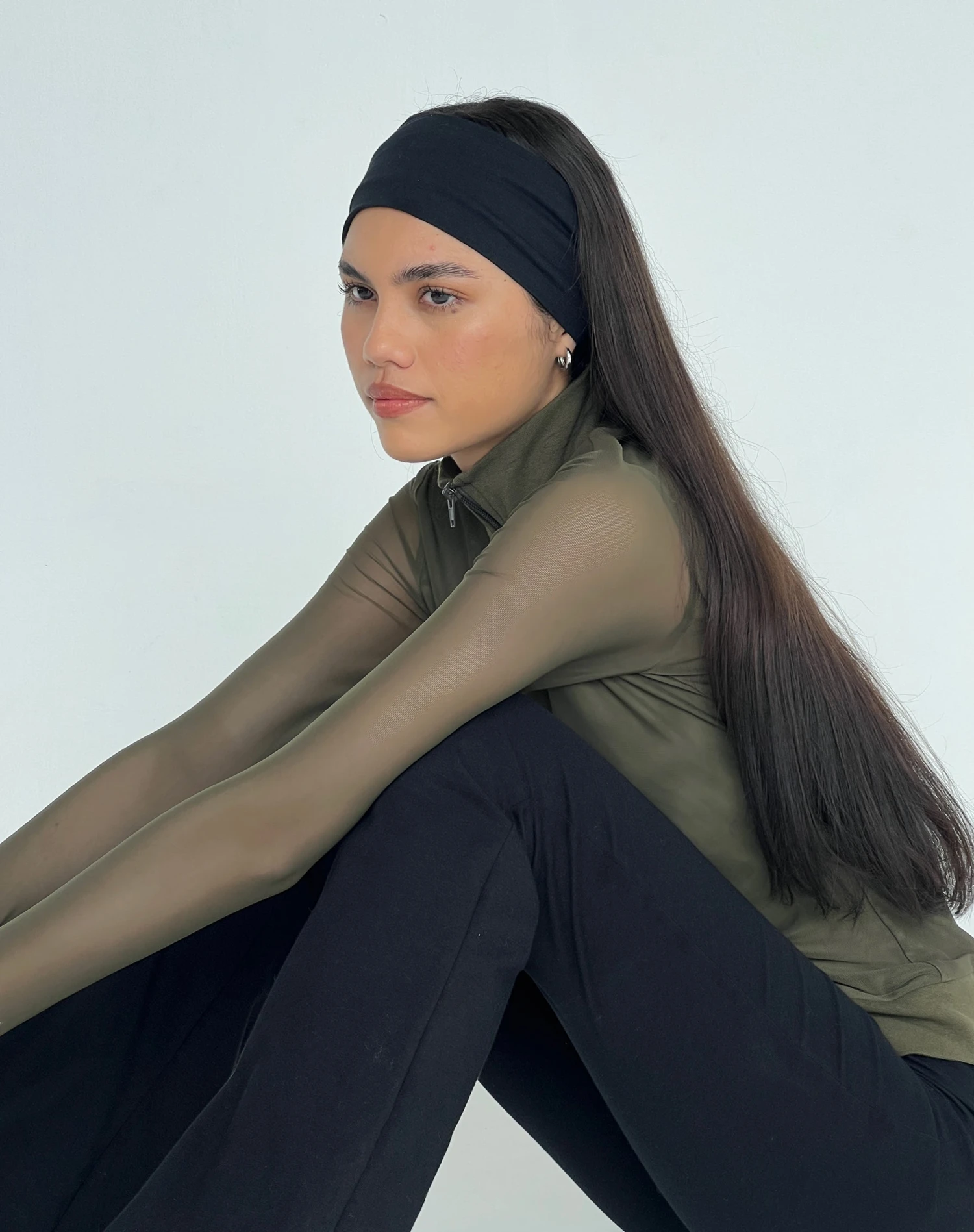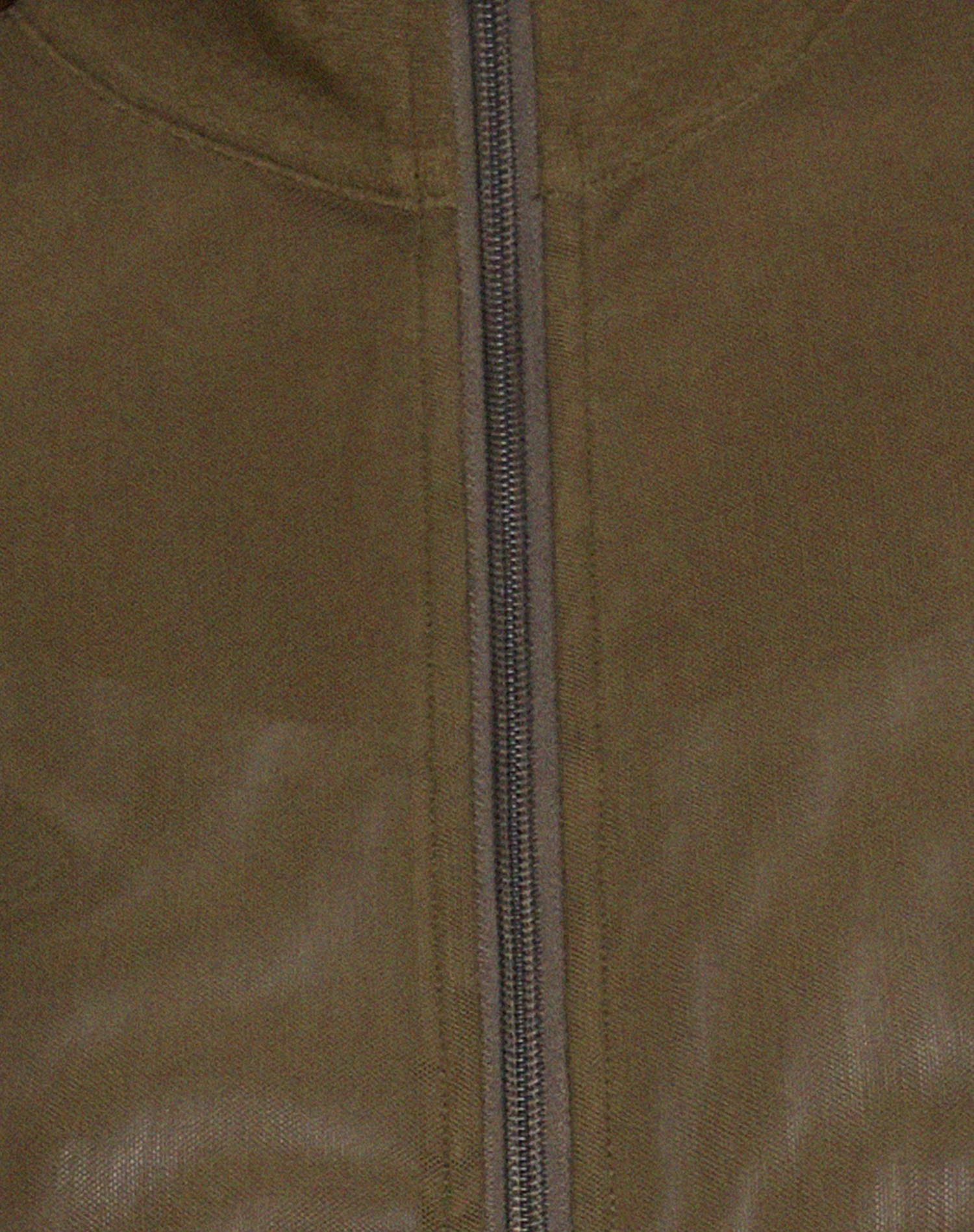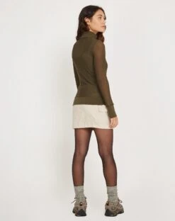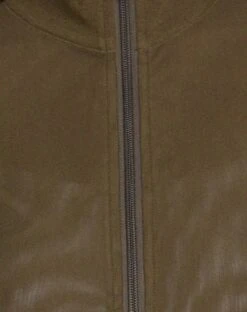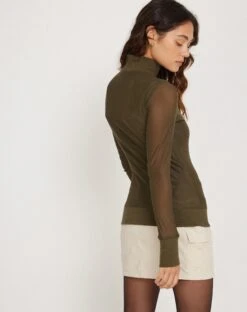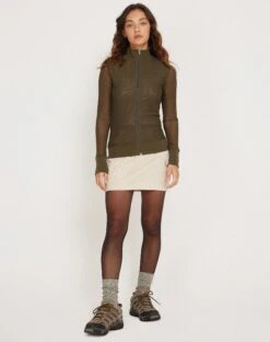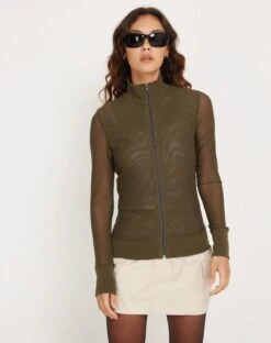Slim-fit jumper with silver zip front in mesh olive. Featuring long, cuffed sleeves and a high neckline. We like to style with our Signe Trousers.
