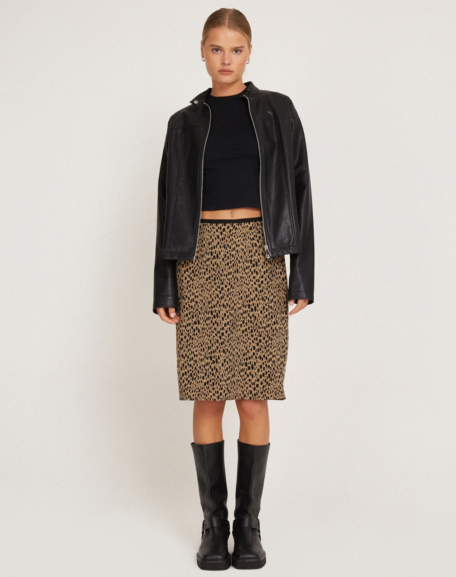 The Har Skirt features a midi length and a bold cheetah print pattern, perfect for an edgier look. We love to style with our Jinsu top.Â