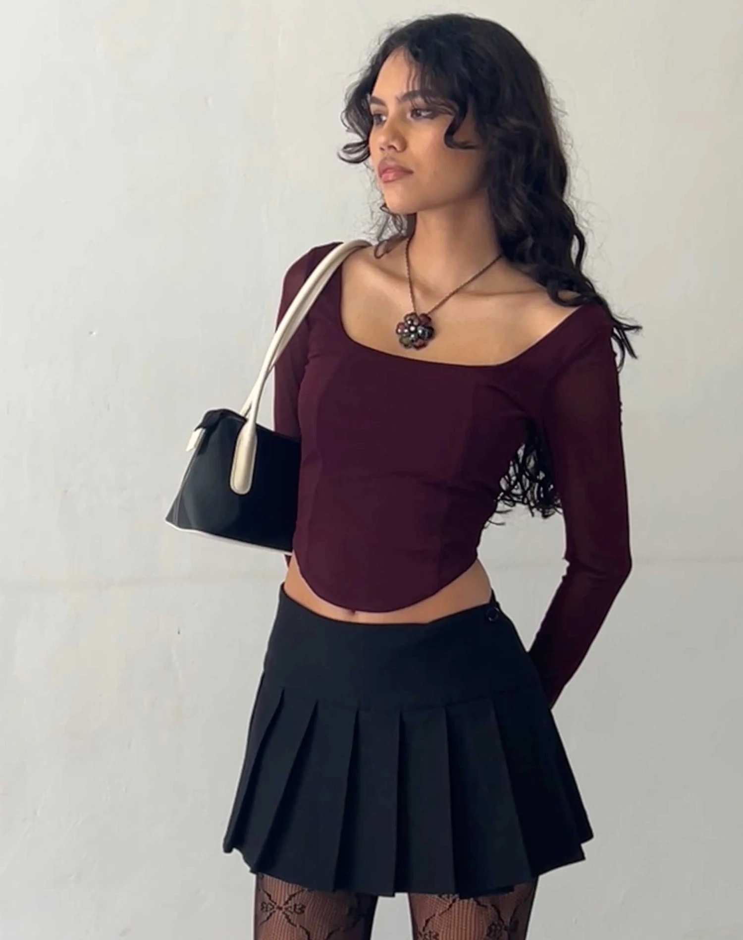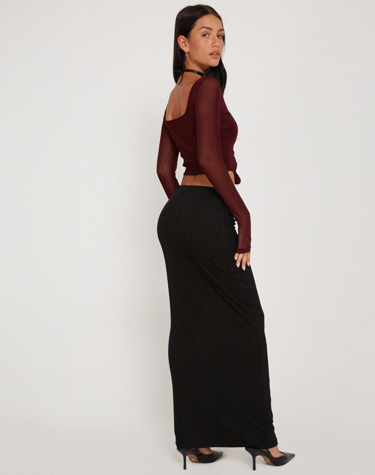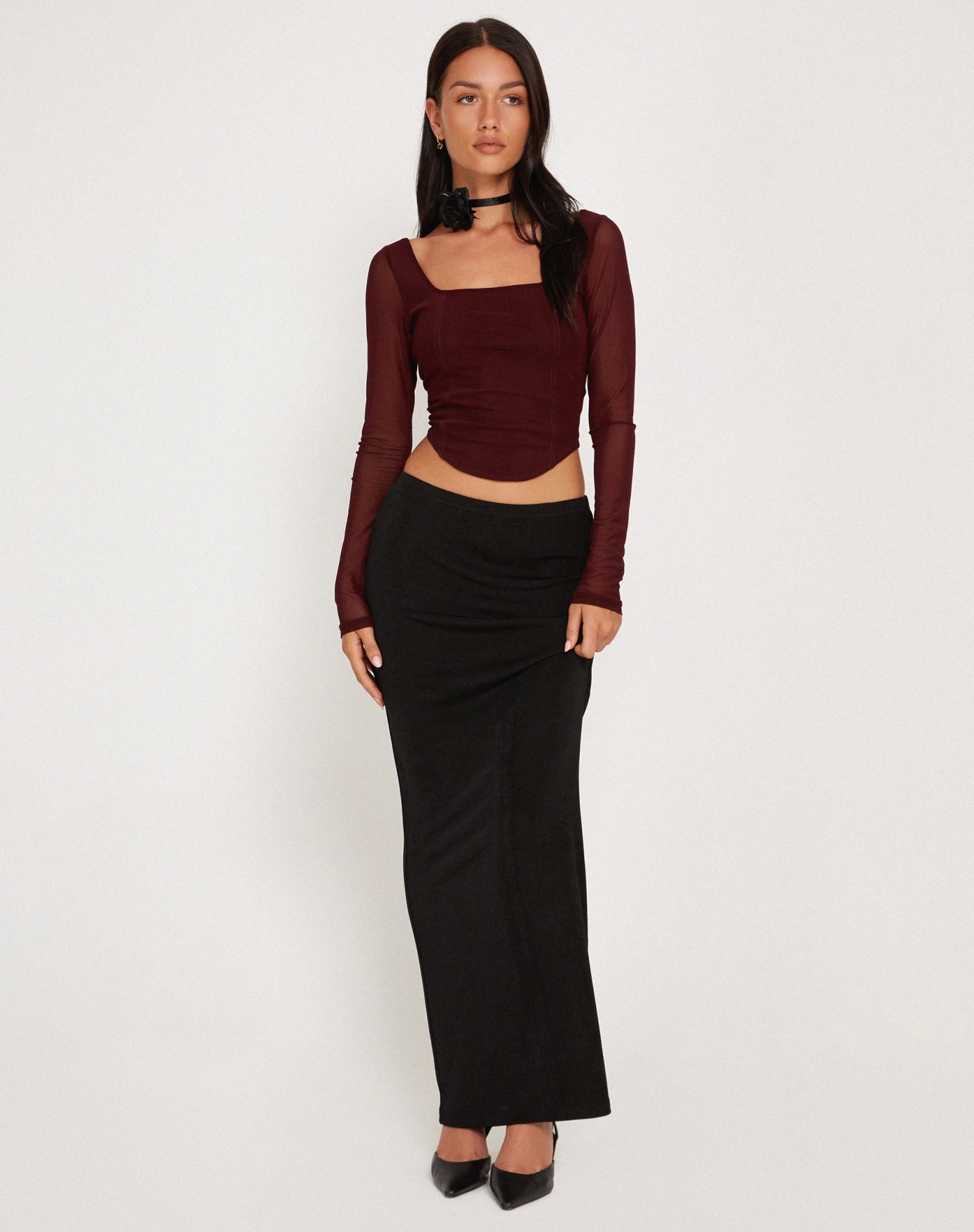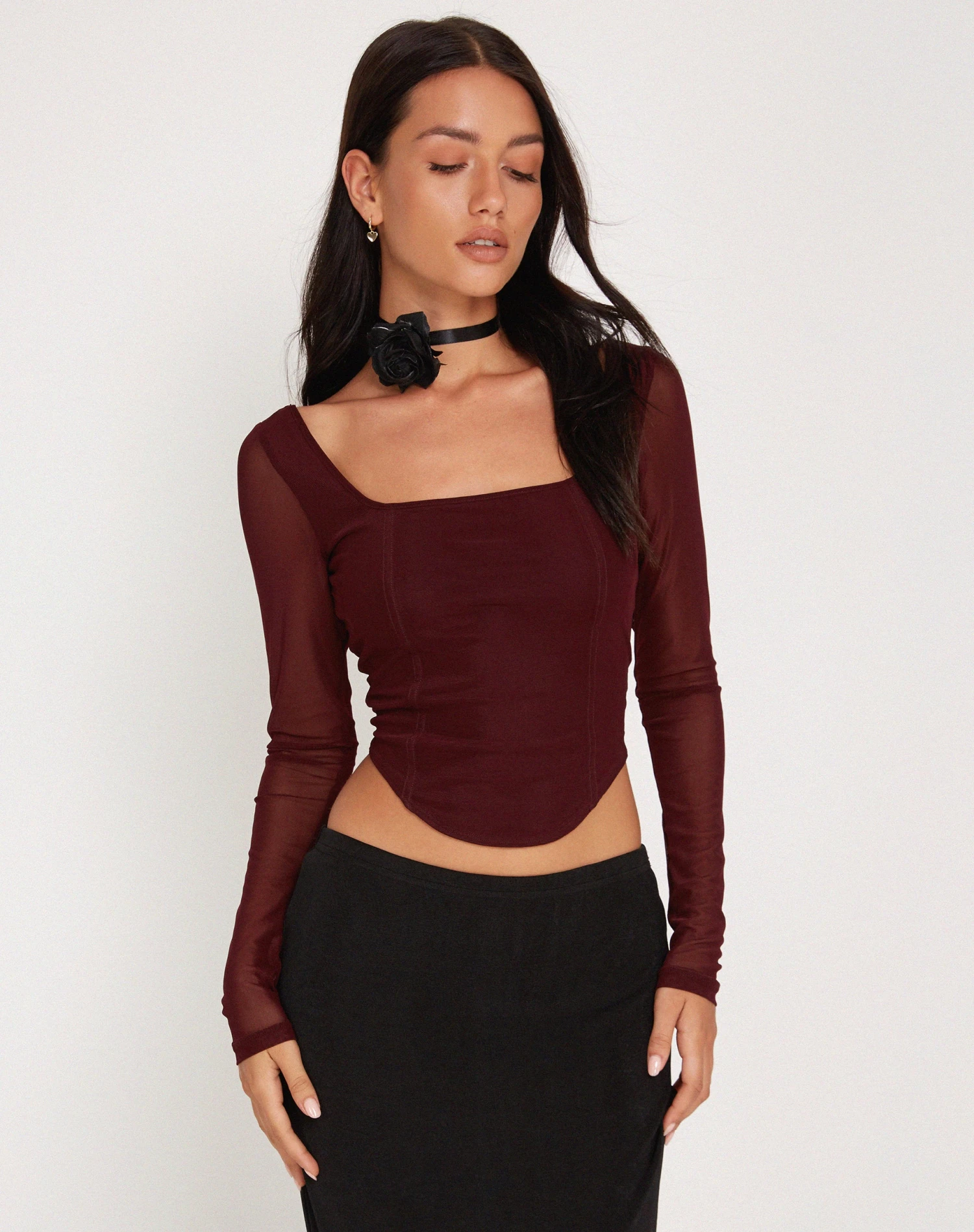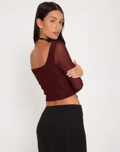Make a statement with our Helsiva top. In a burgundy mesh fabric, it features a cropped, bodycon fit with long sleeves, a square neckline and curved hem. We love to style with our Casini skirt.Â