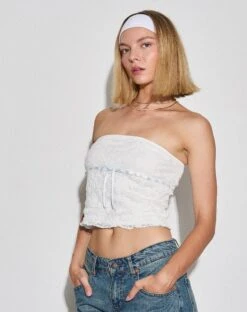 The Ilina Top is a must have this season. Featuring a cropped, bandeau sleeveless fit, with ivory lace trimming and floral embroderie. Also includes a decorative ivory bow.