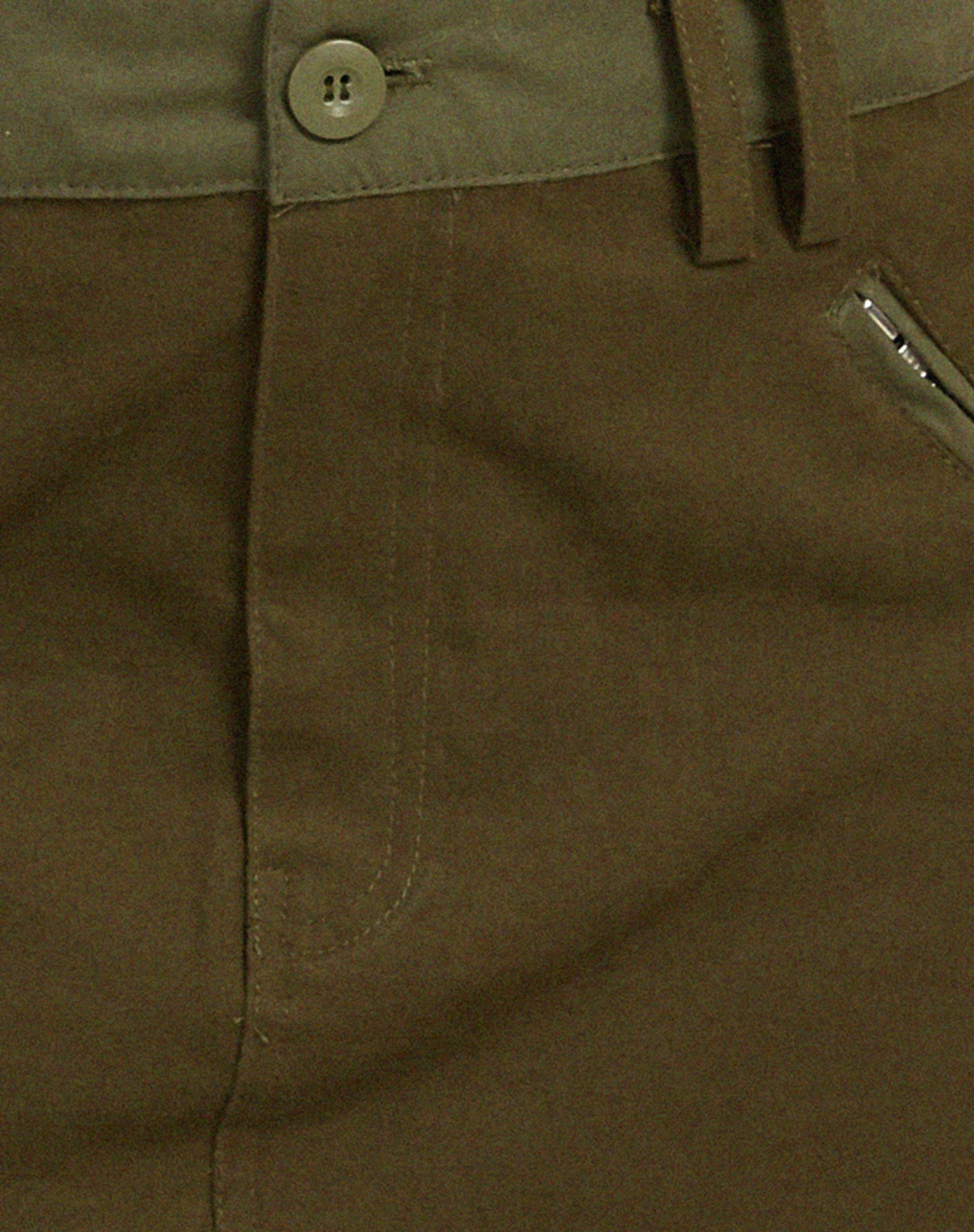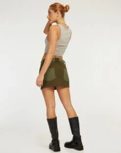 Khaki green two-tone mini skirt featuring back pockets, zip welt pockets to the side, belt loops and a button fastening. Get the look and style with the Vasque top.