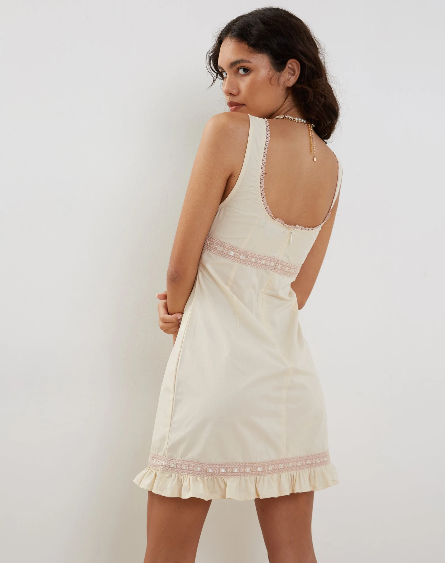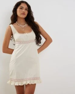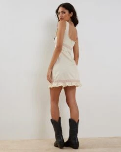 In ivory, the Jacena dress features a loose, mini fit with thick straps and a square neckline with a decorative bow to centre. Detailed with a ruffled hemline and delicate lace.