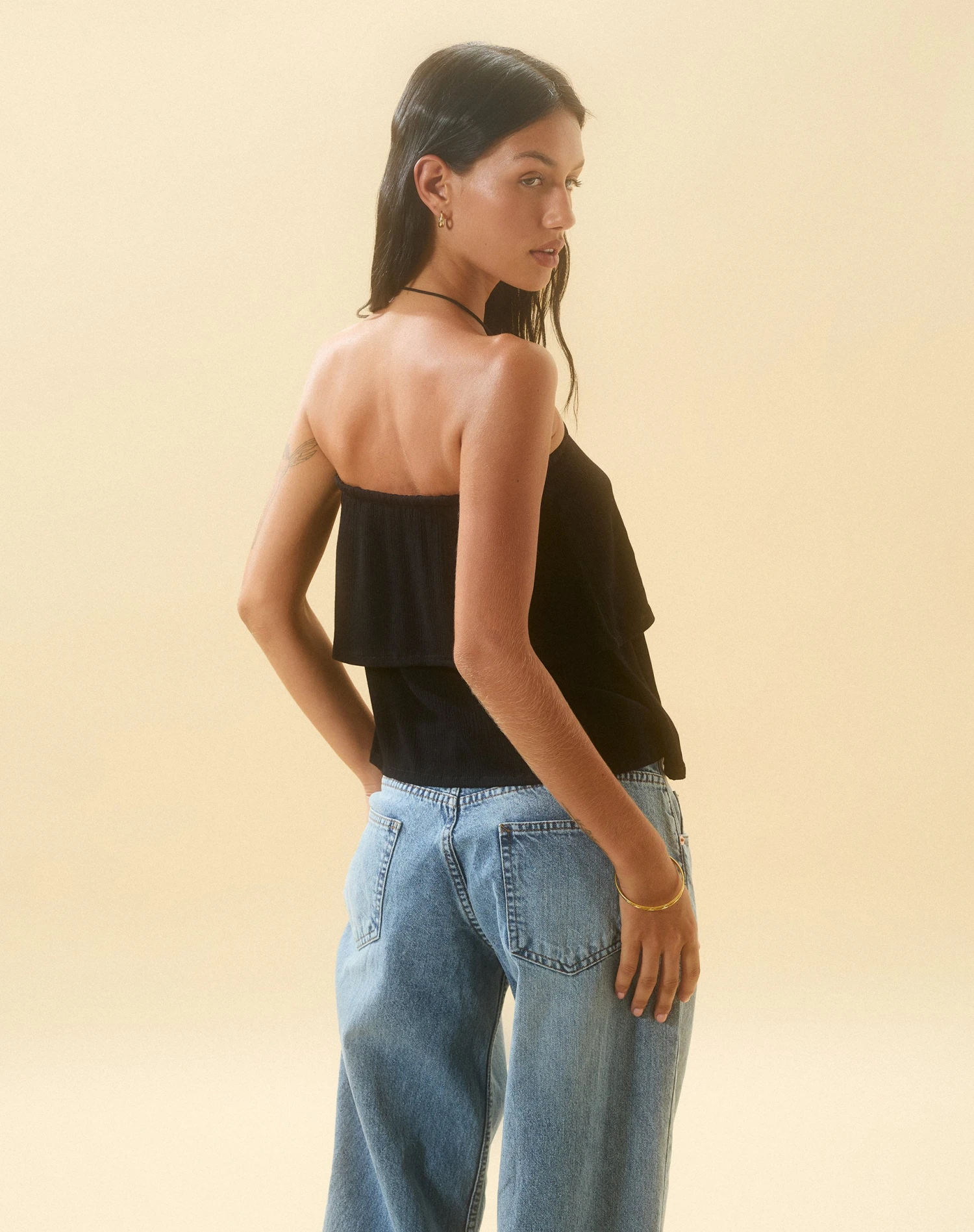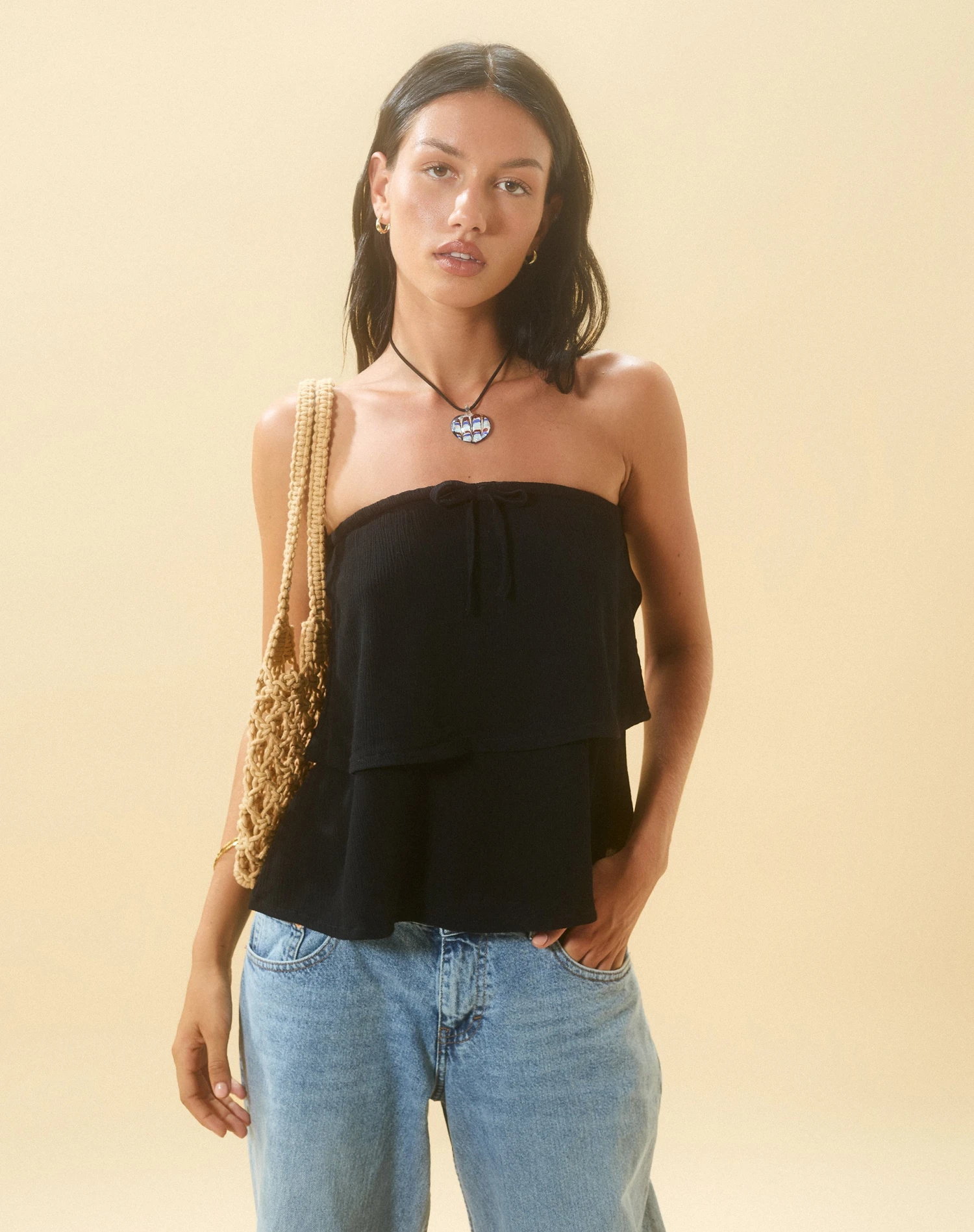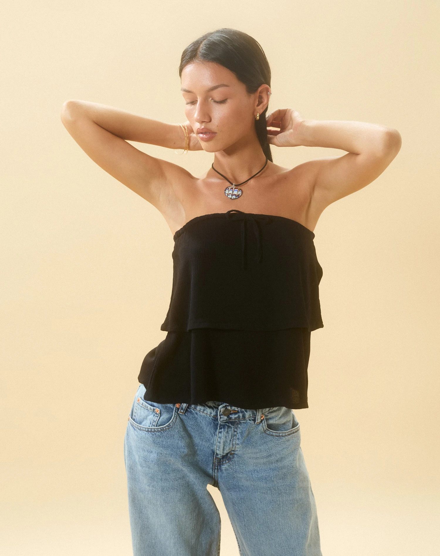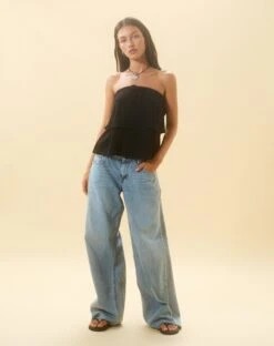 Embrace a Y2K summer in our Jimin top. Featuring a drawstring detail bandeau neckline and double layer hem in a lightweight crinkle black. We love to style with our Roomy jeans.
