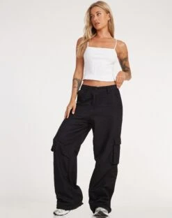 The Jita trouser are essential for your cool yet casual days. In a black hue, these cargo pants feature a high waist, zip and button fastening, wide leg and pocket detailing. Our Keenan top in white will finish this look off.